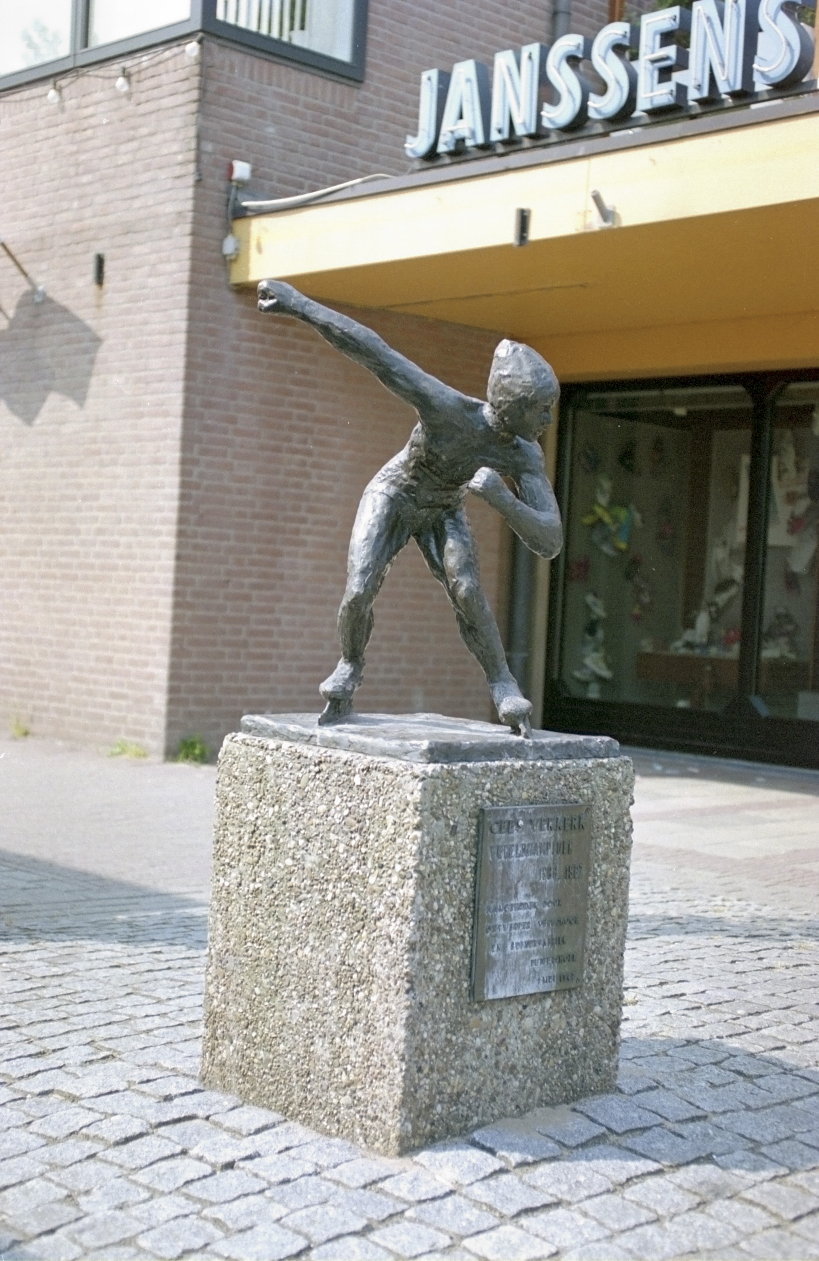 - Beeld van schaatser Kees Verkerk bij het winkelcentrum op het Oranjeplein in Puttershoek.
