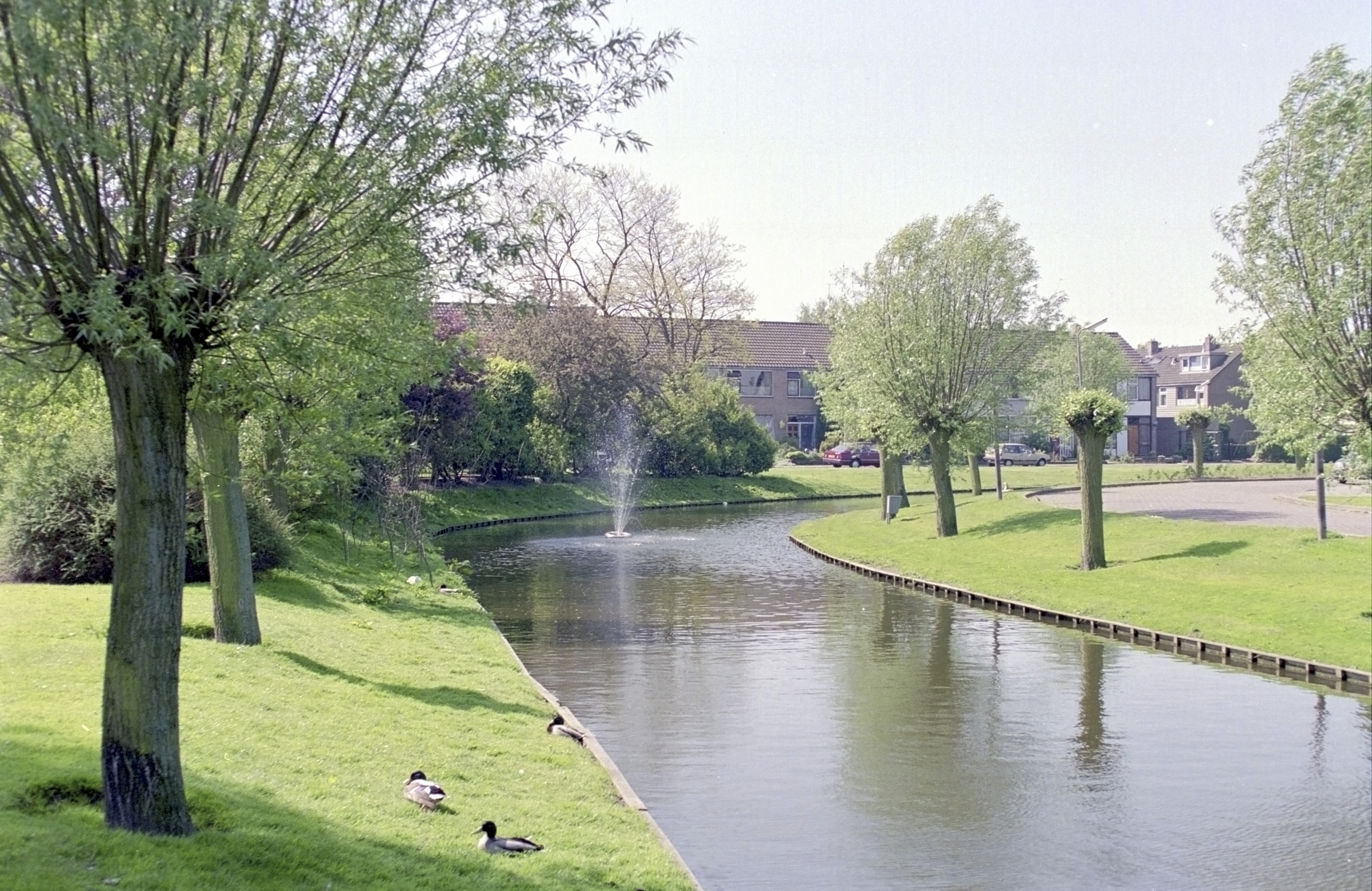 Vijver tussen de Claes Danckaertzstraat en de Rozenlaan (rechts), gezien vanaf de Lindenlaan in Klaaswaal.