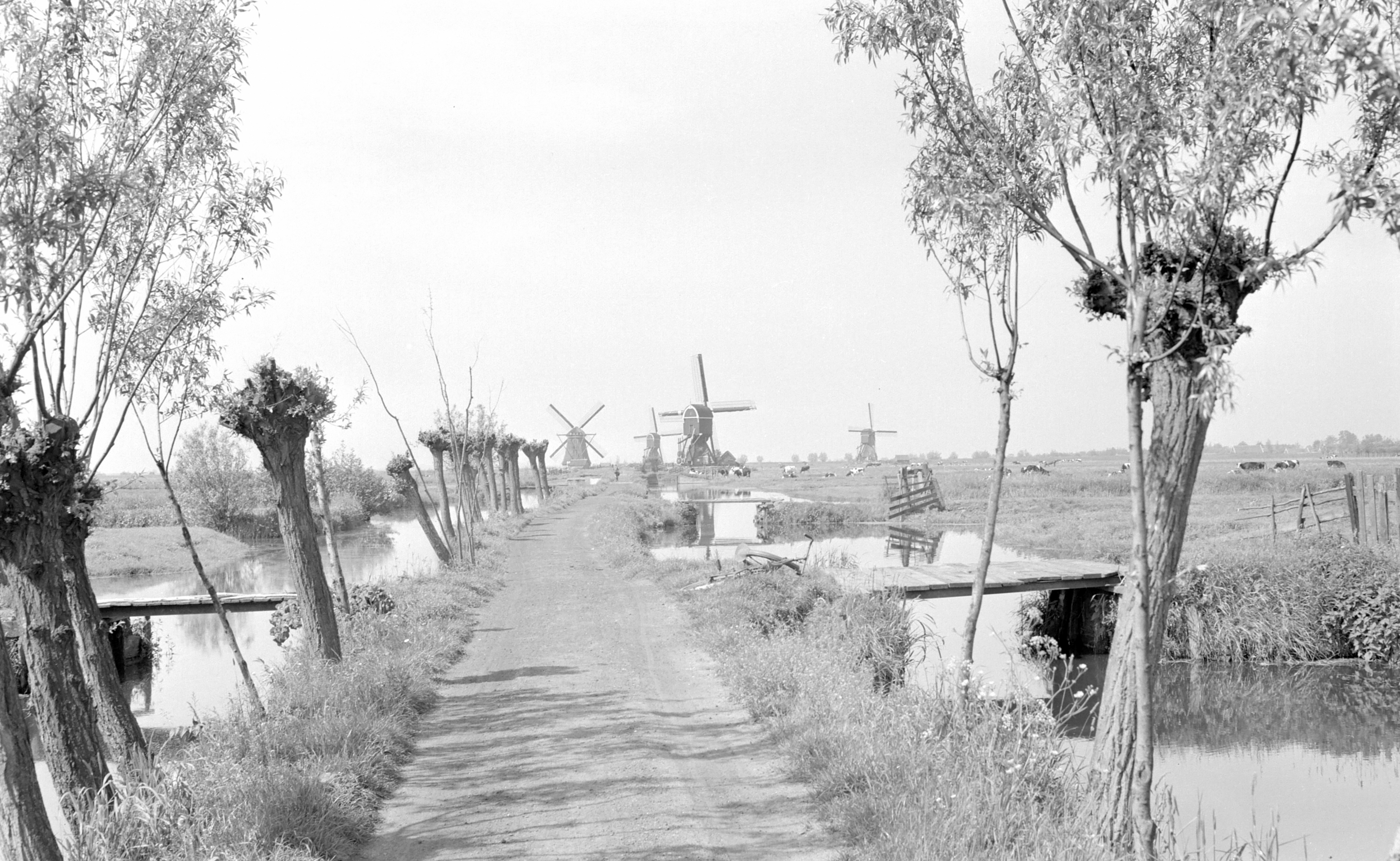 Vooraan de bestaande wipmolen Kleine Tiendwegmolen, links de bestaande Achtkante molen, midden achter wipmolen Hoge Tiendswegsemolen (verbrand in 1962 en deels herbouwd), achter rechts wipmolen de Sluismolen (verbrand 1979). De opname dateert dus van voor 1962.