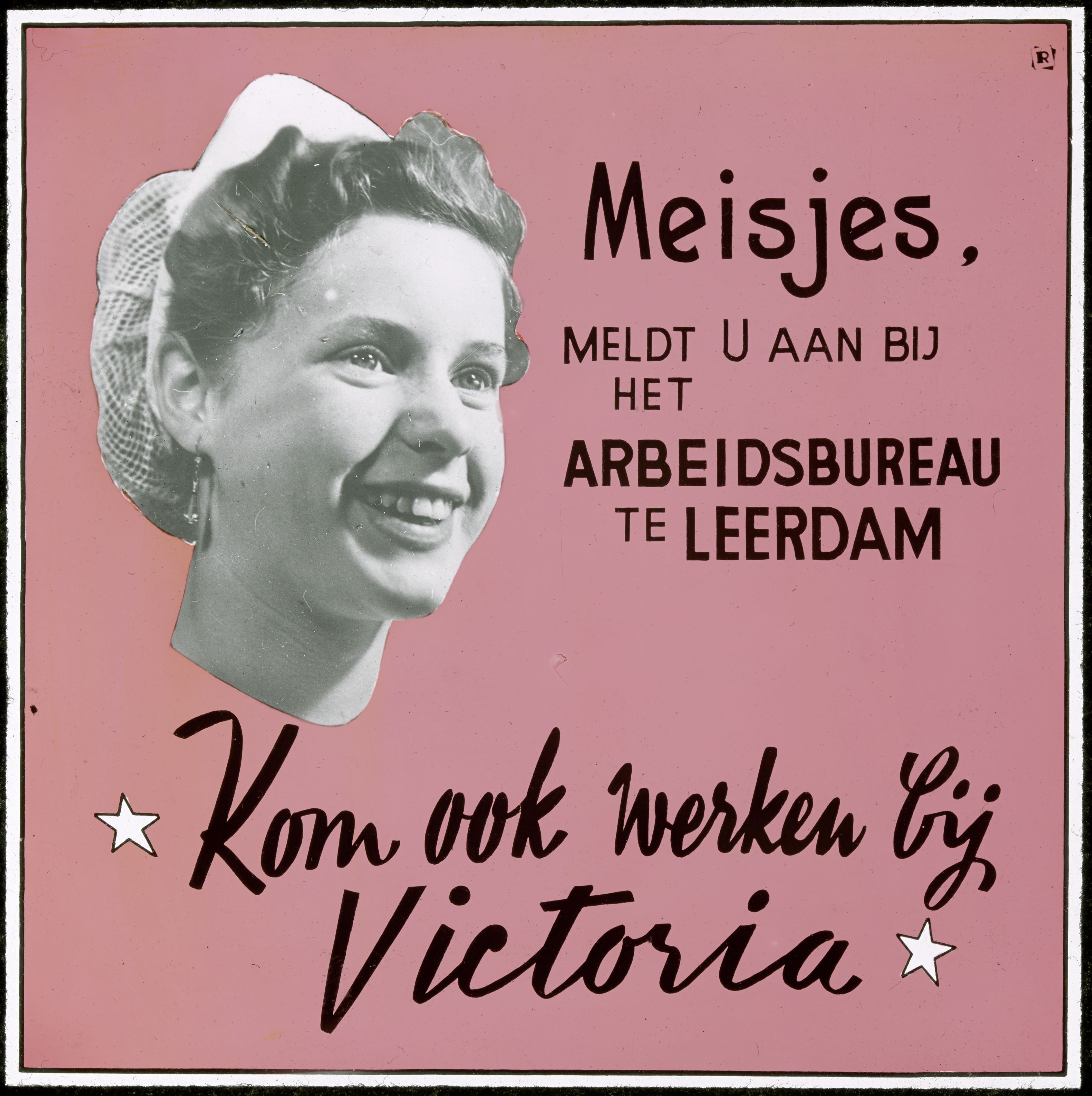 - Wervende poster voor meisjes om zich aan te melden bij het arbeidsbureau in Leerdam, om werk te vinden bij chocolade- en biscuitfabriek Victoria in Dordrecht.