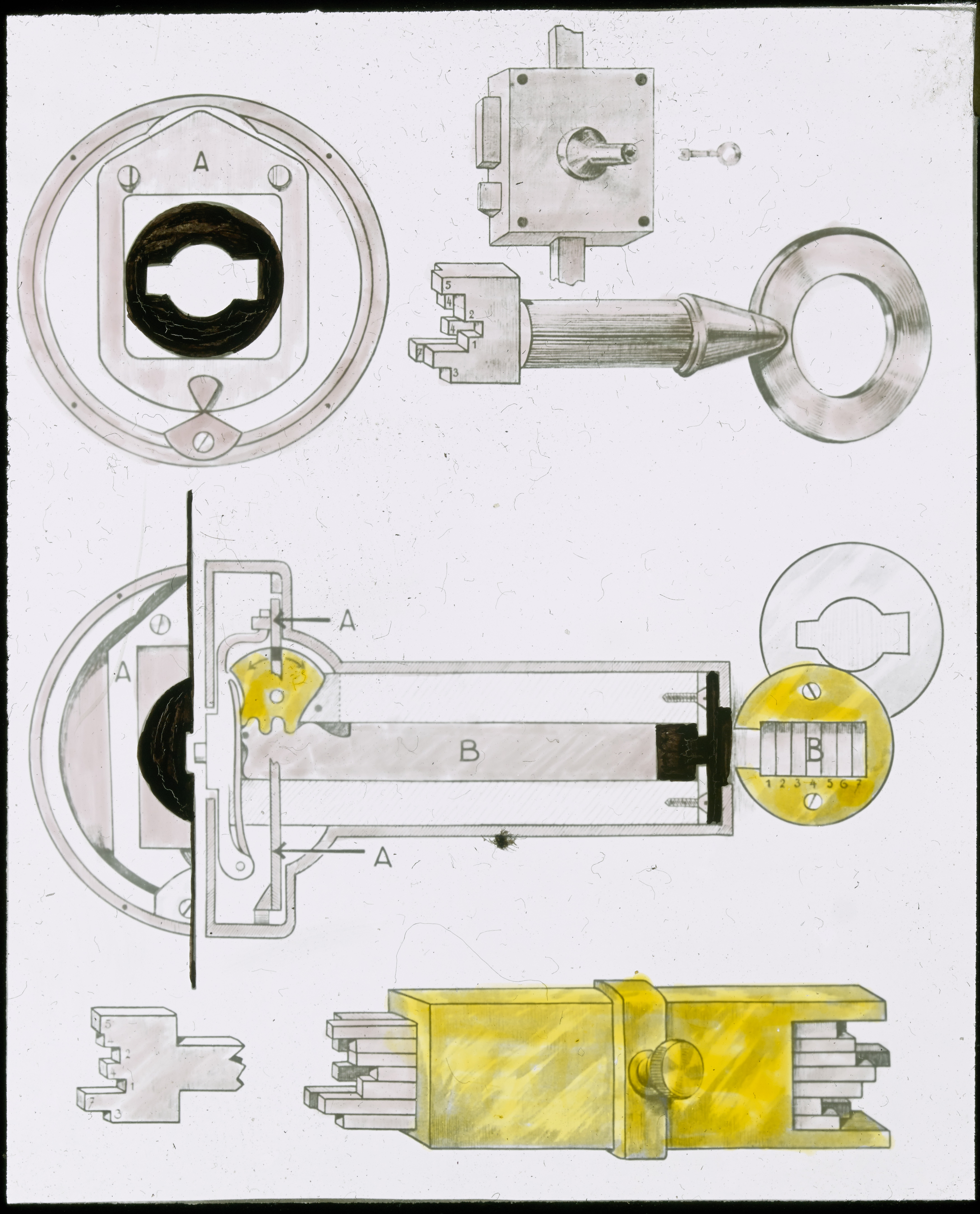Ontwerp van slot met pensleutel van de Lips brandkasten- en slotenfabrieken.
