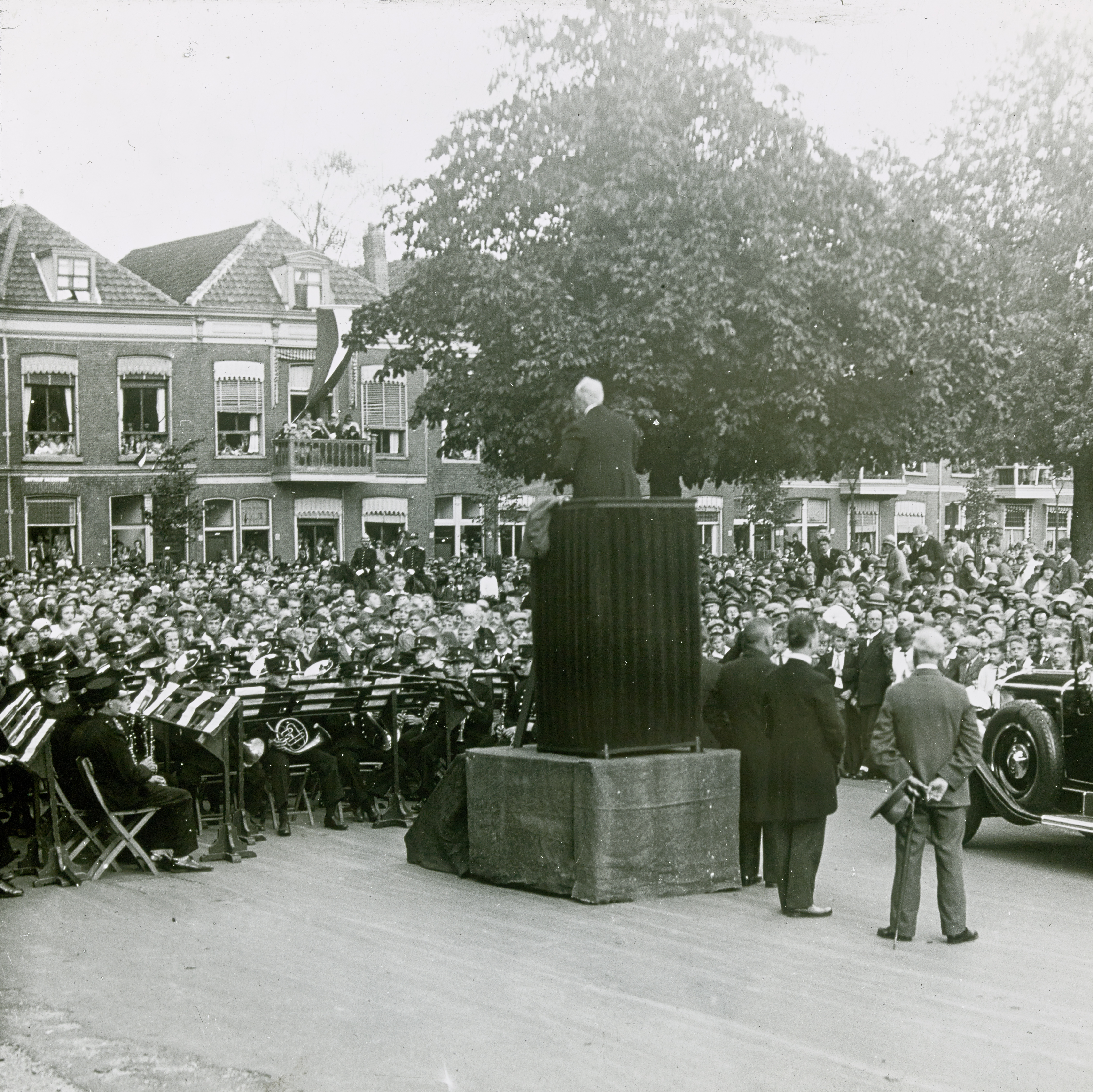 Dirigent Erdelmann op het Beverwijcksplein tijdens het bezoek van Koningin Wilhelmina …