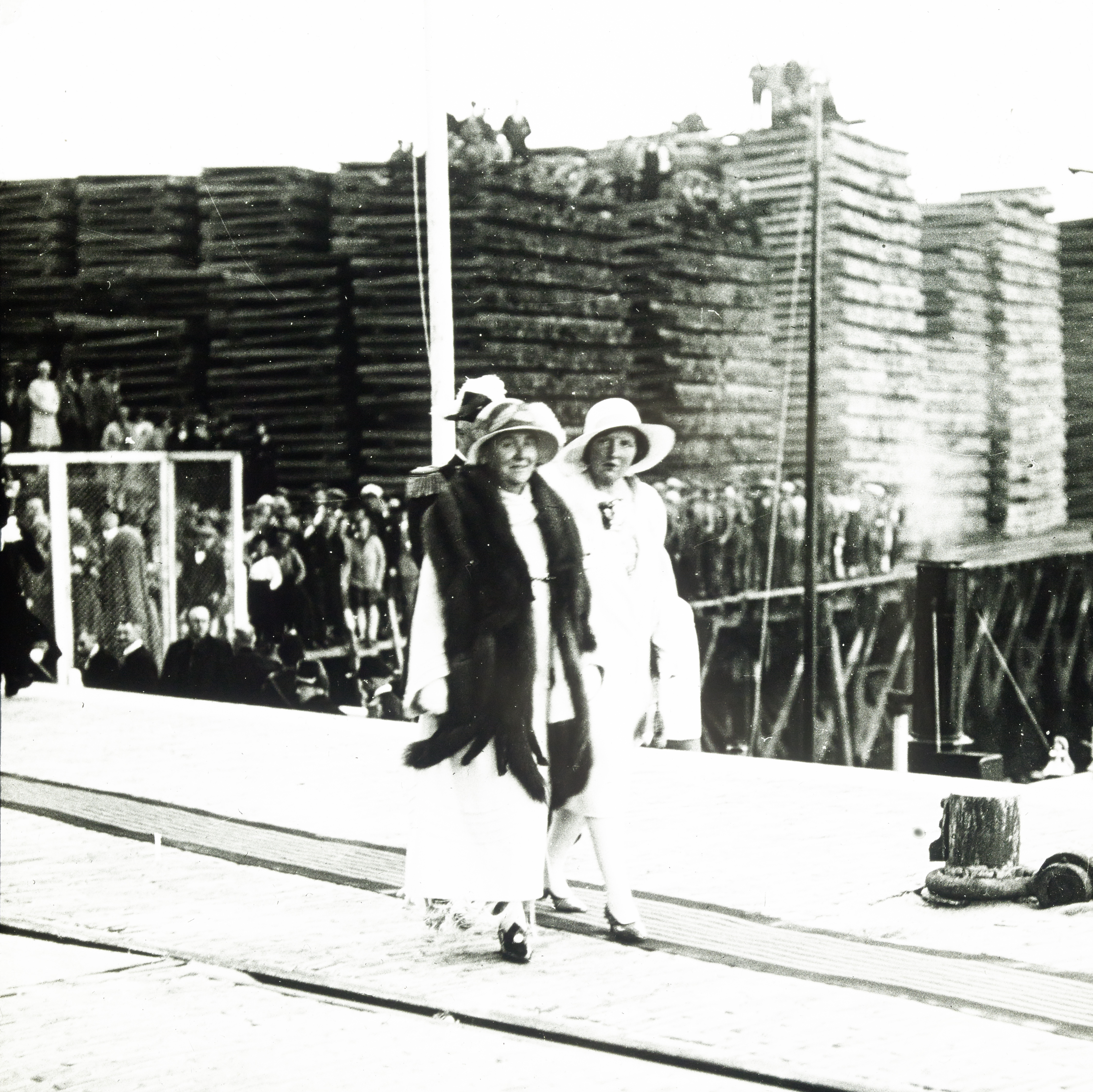 - Koningin Wilhelmina, prins Hendrik en prinses Juliana bij de heropening van de vernieuwde Zeehaven. Op de achtergrond opgeslagen hout bij de creosoteerinrichting.