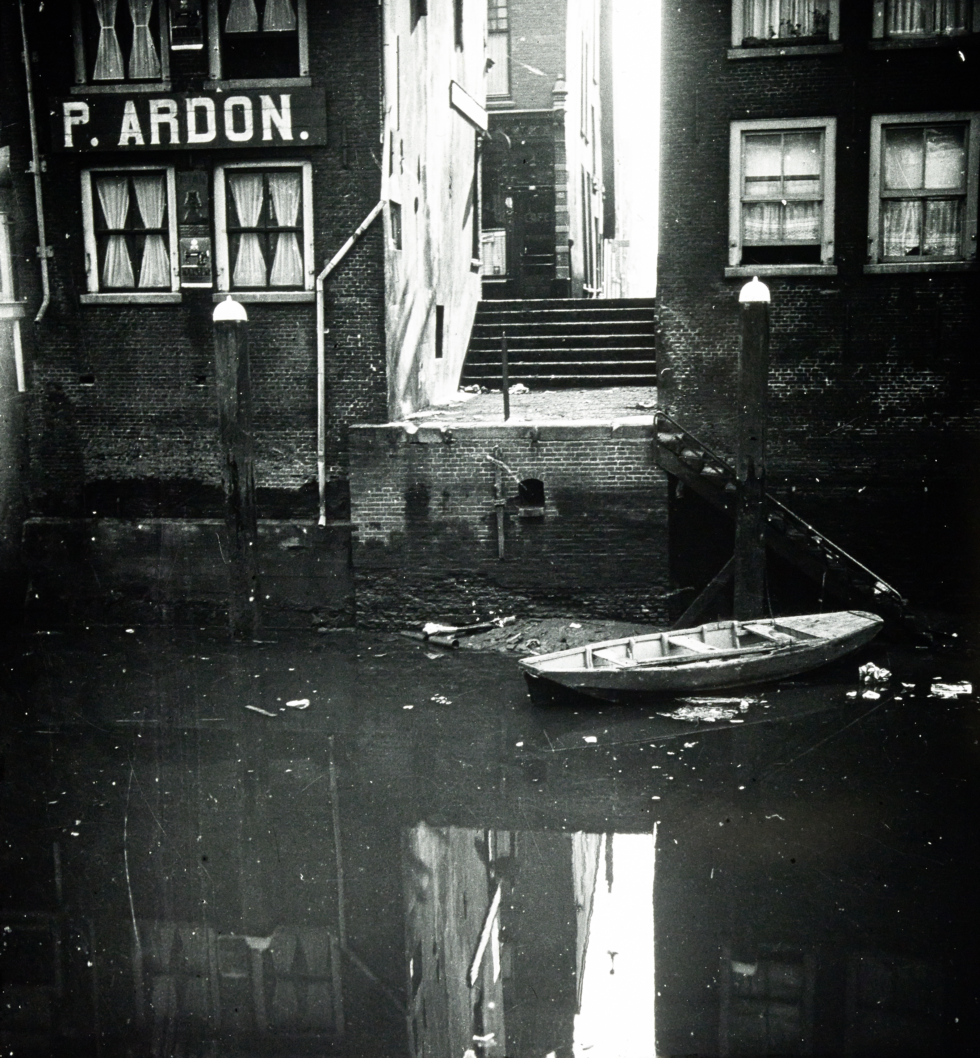 - Achterzijde van naaimachinehandel Ardon op de Voorstraat, hoek Dolhuissteiger.