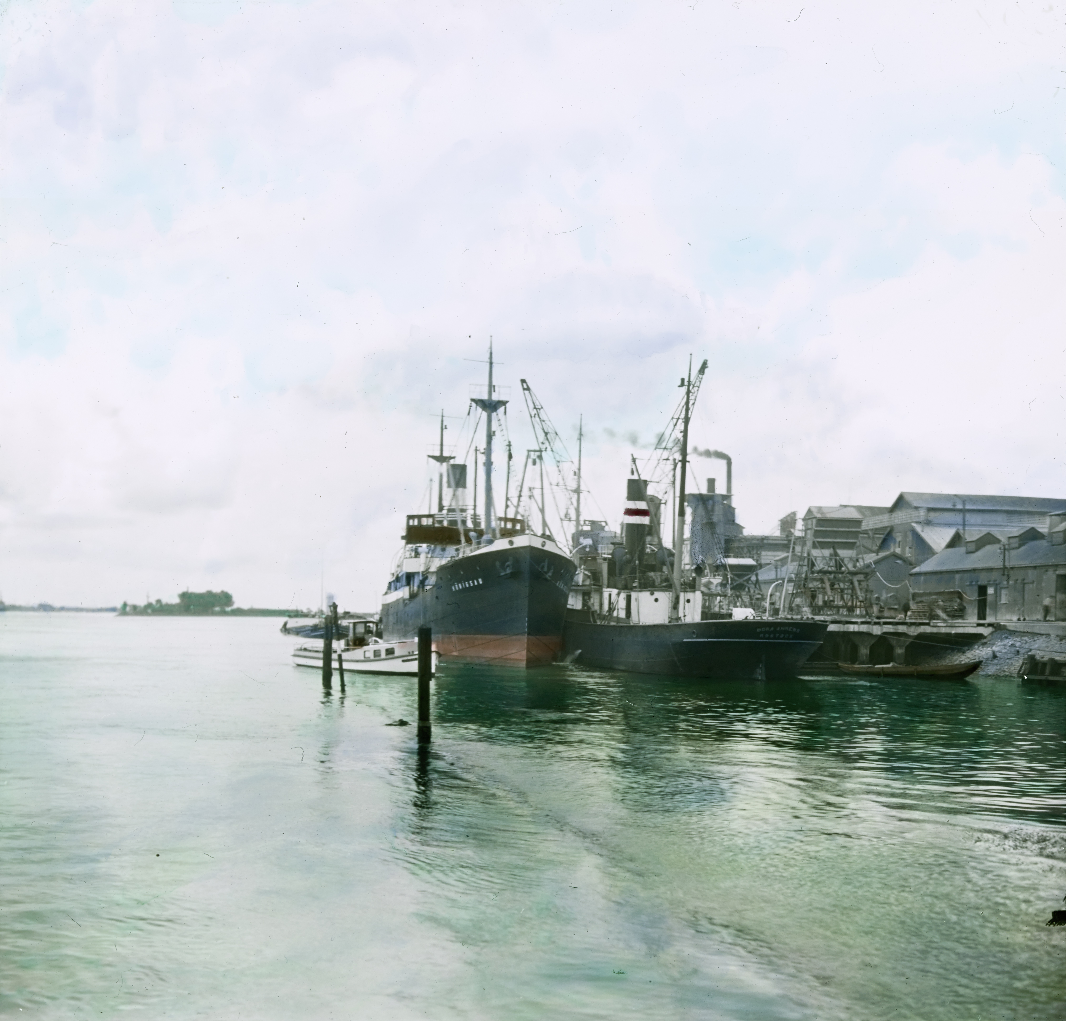 De schepen liggen i.i.g. bij de fabrieken aan de Lindtsedijk te Zwijndrecht afgemeerd. Van het binnenste schip, de Dora Ahrens met als thuishaven Rostock zie ik een scheepvaartbericht in de krant van 23-8-1928 in relatie tot Zwijndrecht ,maar kan het volledige bericht niet lezen omdat helaas momenteel de gehele krantencollectie bij het RAD offline is en er sinds 2 dagen niet in gebladerd kan worden.