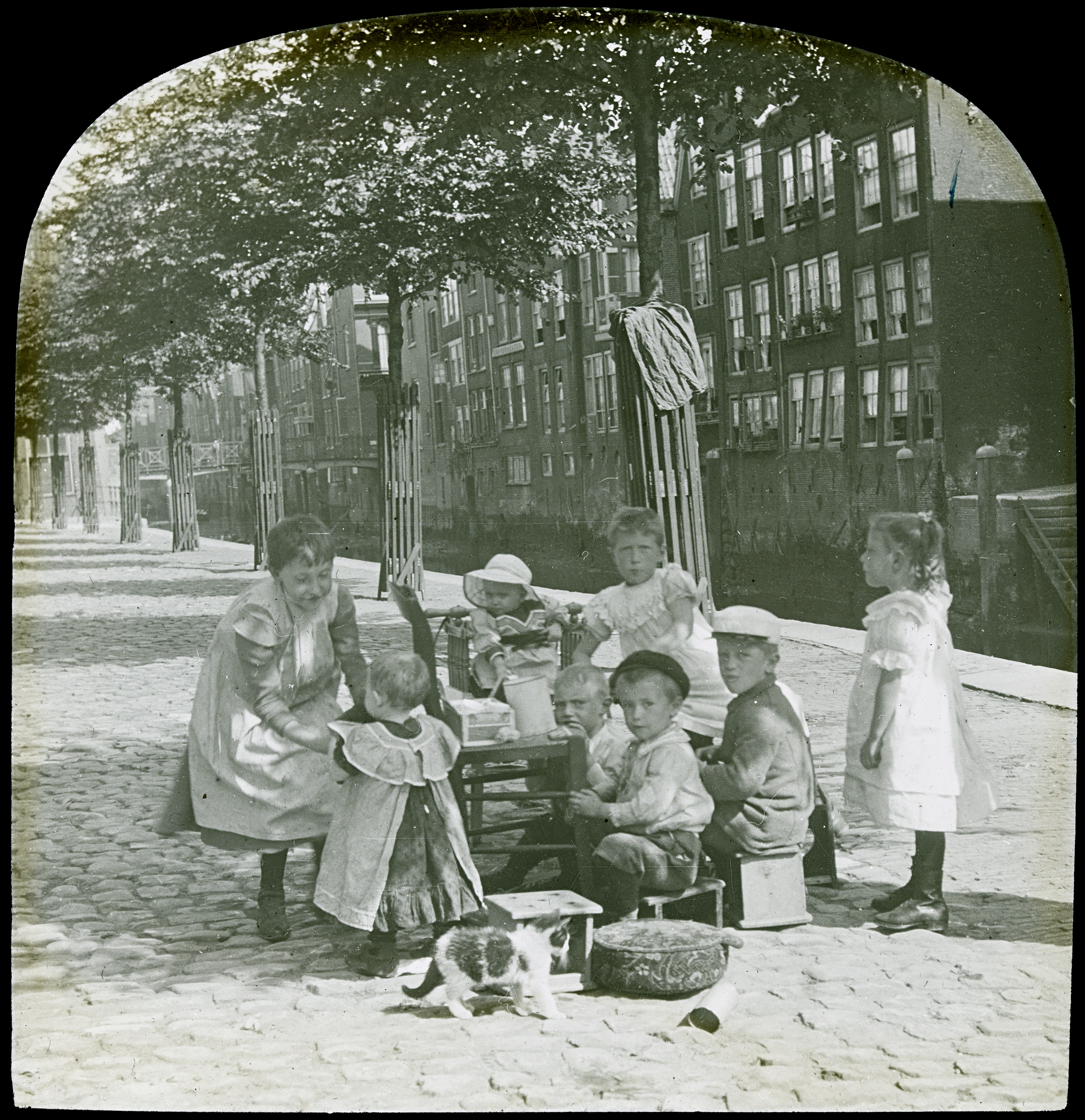 - Vermaak in de buitenlucht op de Pottenkade. Geheel rechts de Dolhuissteiger en verder de huizen aan de Voorstraat.