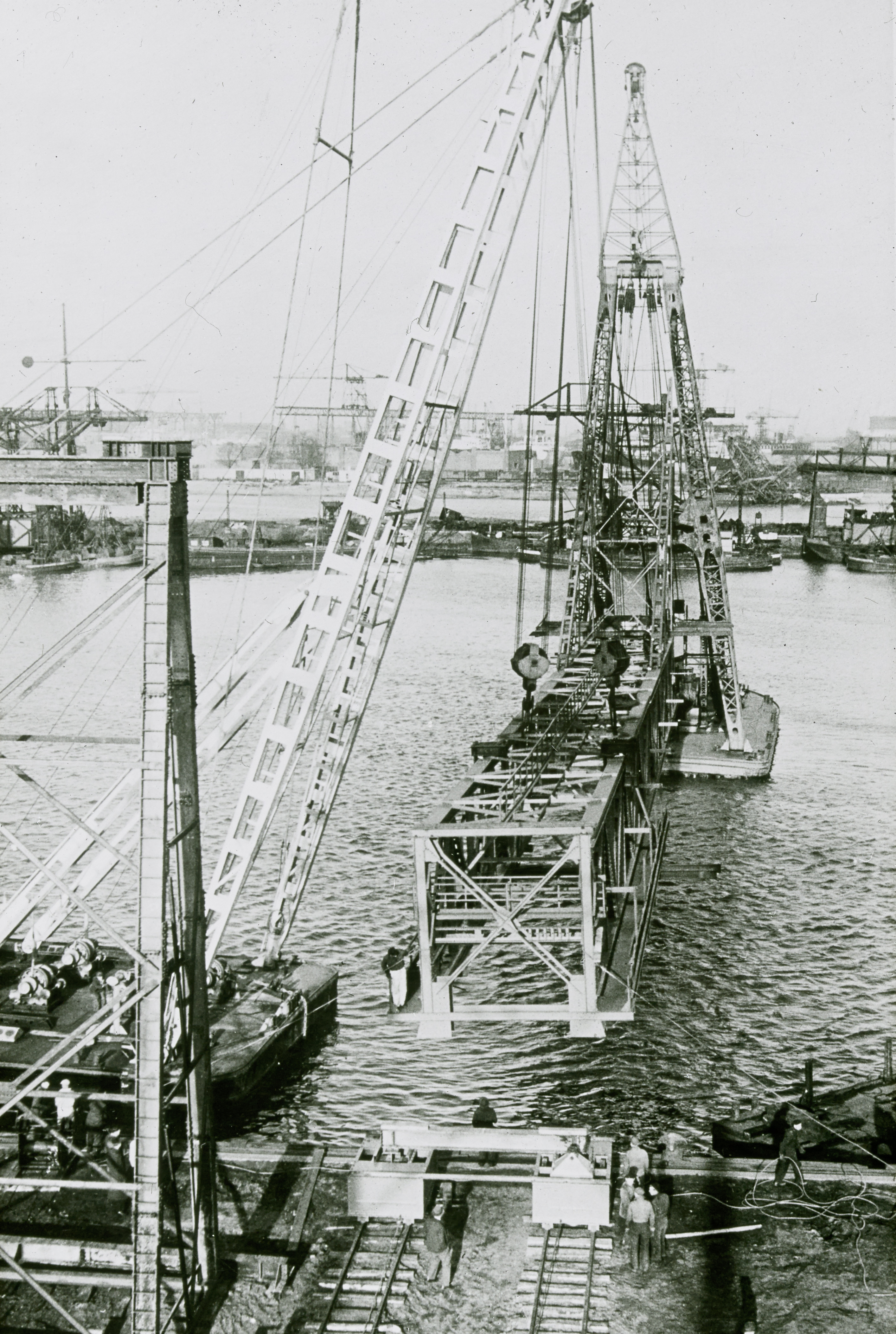 - Het ophijsen van een na oorlogsschade door P&B gerenoveerde brugkraan op het terrein van Thomsen’s Havenbedrijf, pier 6 in de Waalhaven, Rotterdam.
