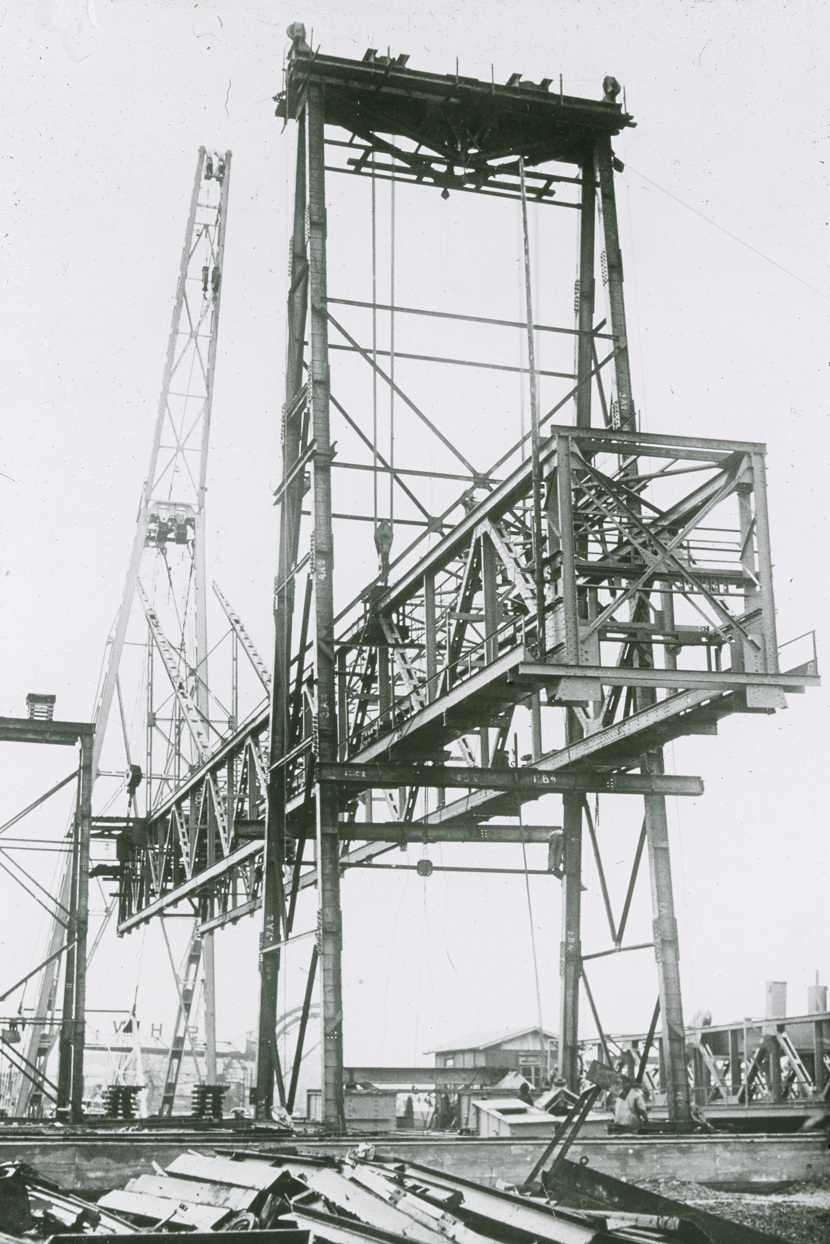 - Het ophijsen van een na oorlogsschade door P&B gerenoveerde brugkraan op het terrein van Thomsen’s Havenbedrijf, pier 6 in de Waalhaven, Rotterdam.