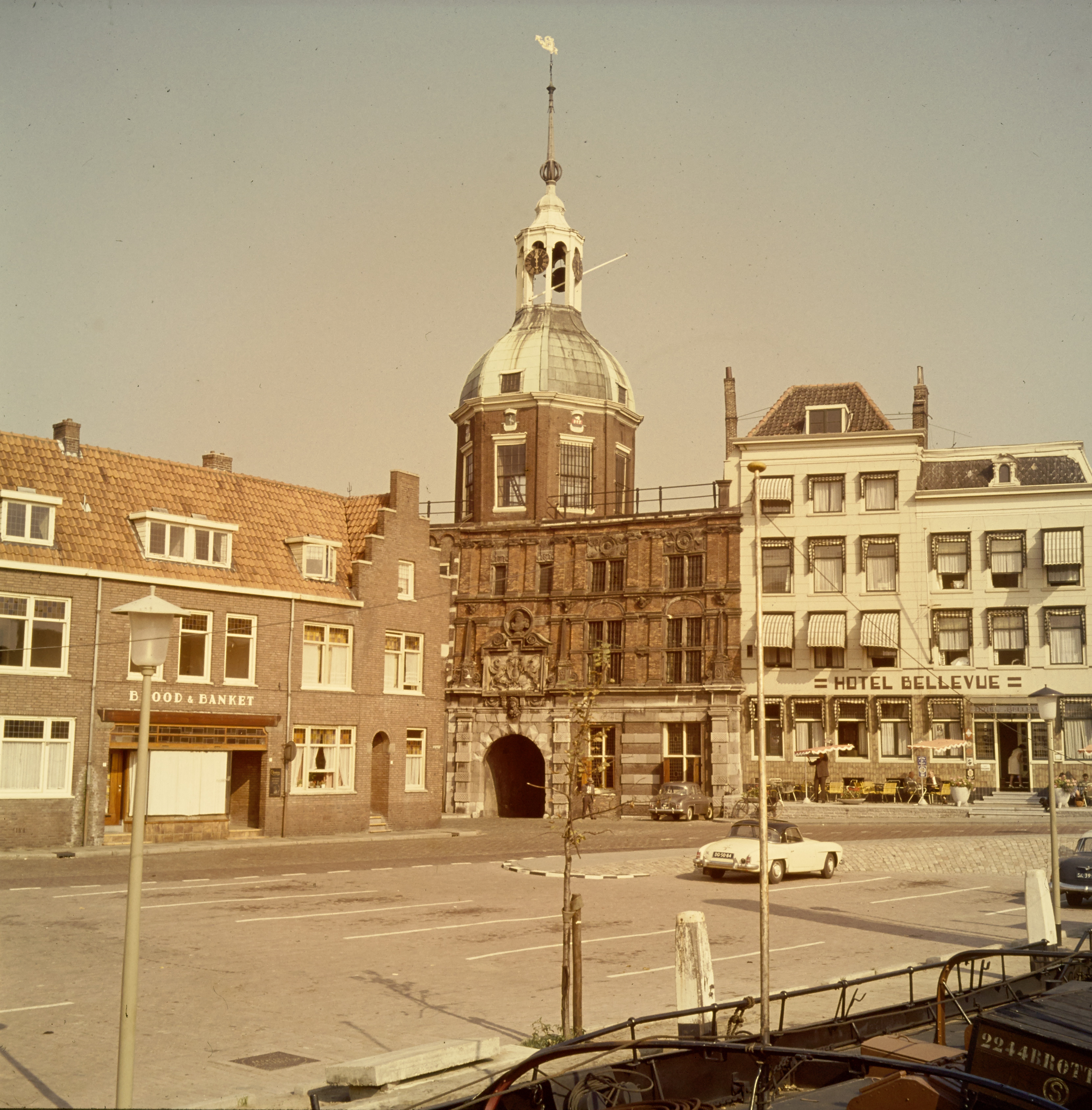 Hoek Wijnstraat / Boomstraat met de Groothoofdspoort en Hotel Bellevue.