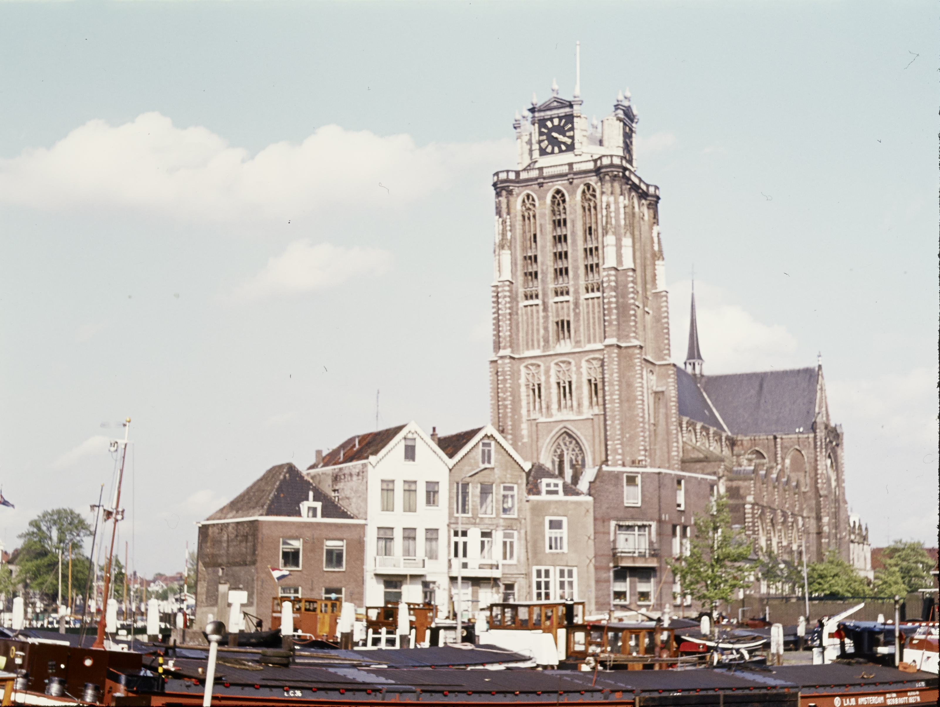 De Grote Kerk en Korte Geldersekade gezien over de Bomhaven.