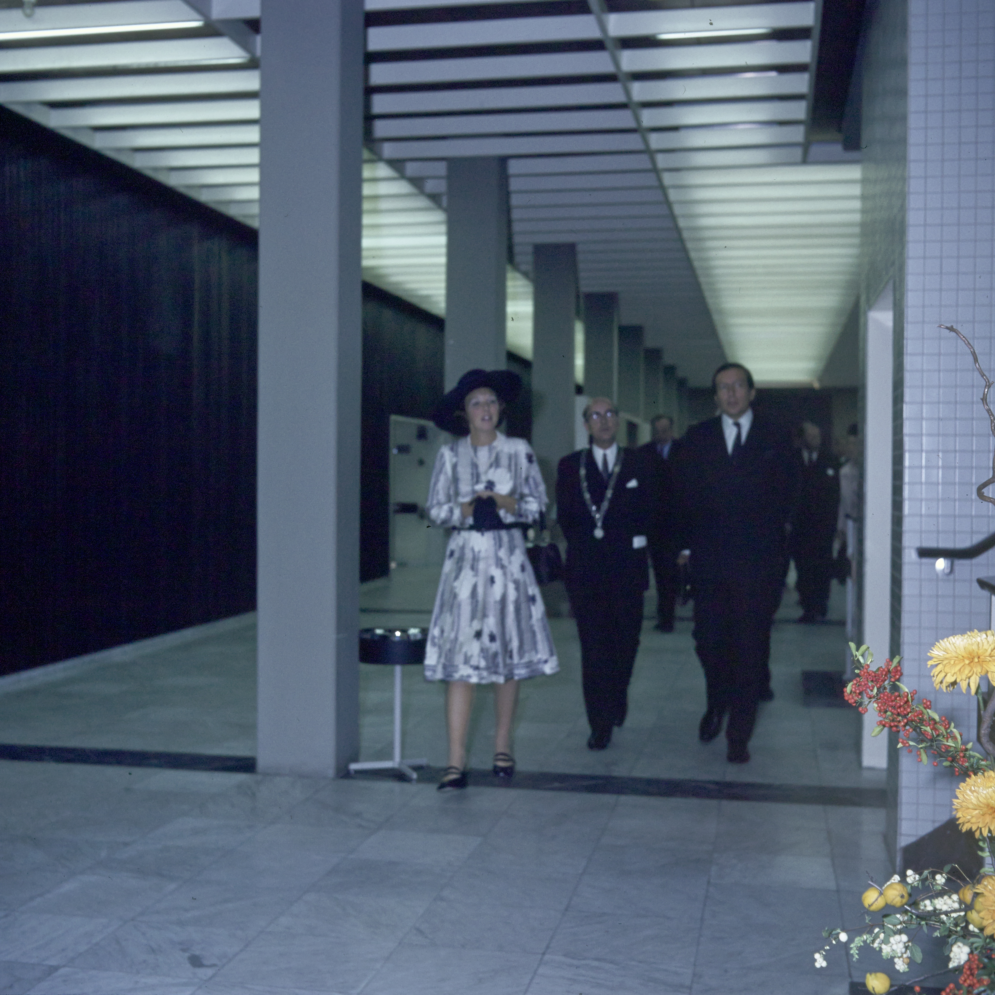 Prinses Beatrix en Prins Claus op bezoek in het stadskantoor, vergezeld door burgemeester Van der Lee.