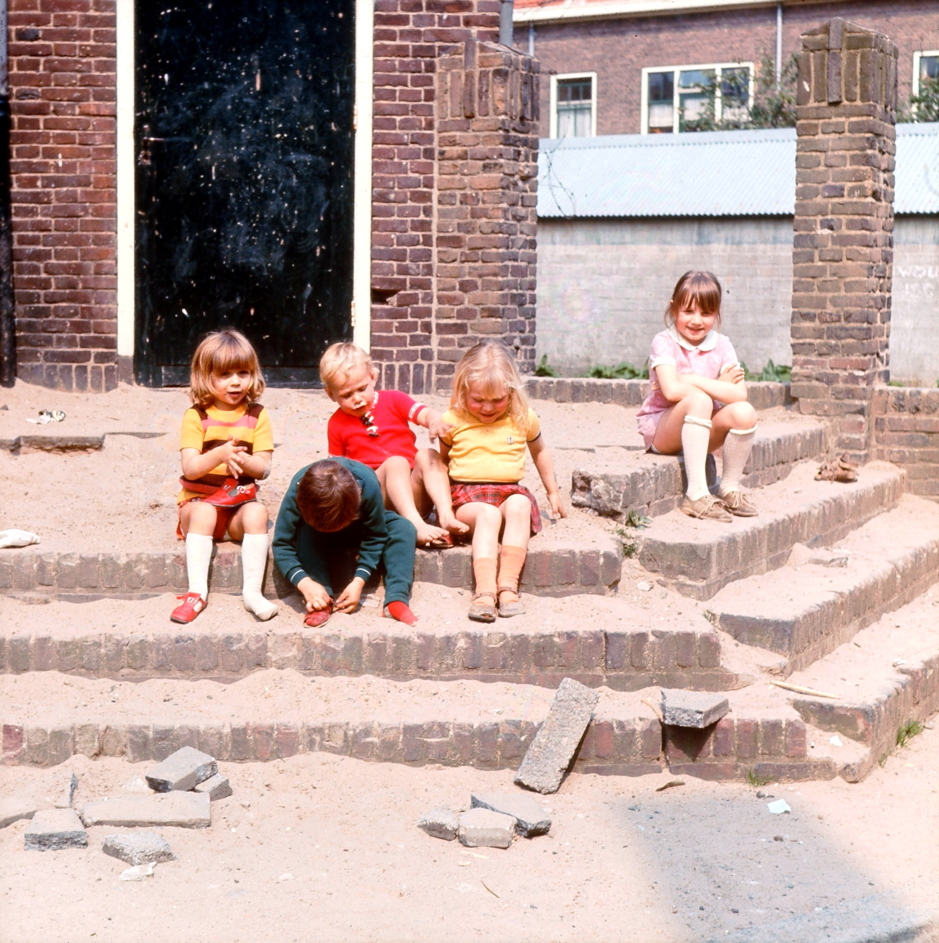 - Kinderen op het trapje naast het badhuis in de Goeverneurstraat.