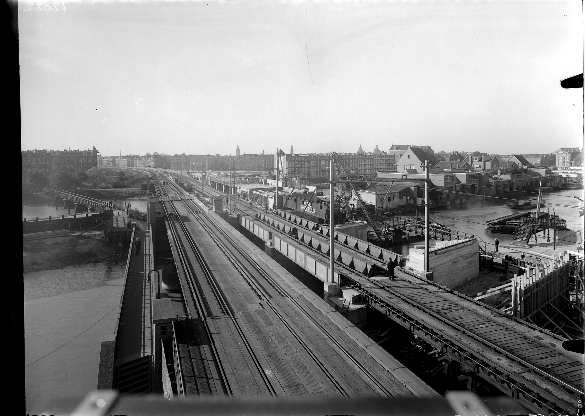 - De spoorbrug over het Lozingskanaal en de Nieuwe Vaart in Amsterdam ter hoogte van de Cruquiuskade (links) en het Zeeburgerpad.