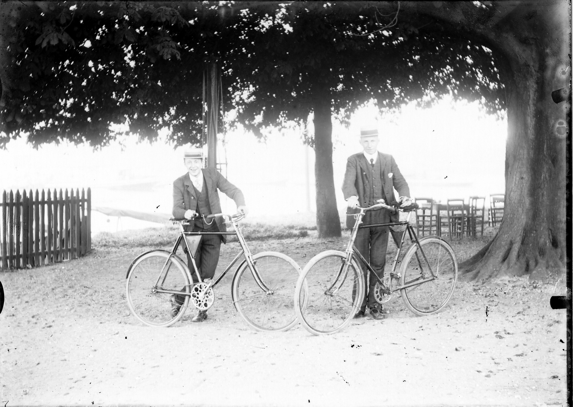 twee staande mannen met hoed en fiets (herenfiets met driehoekige fietstasjes) onder boom; (hek, tafel met stoelen)