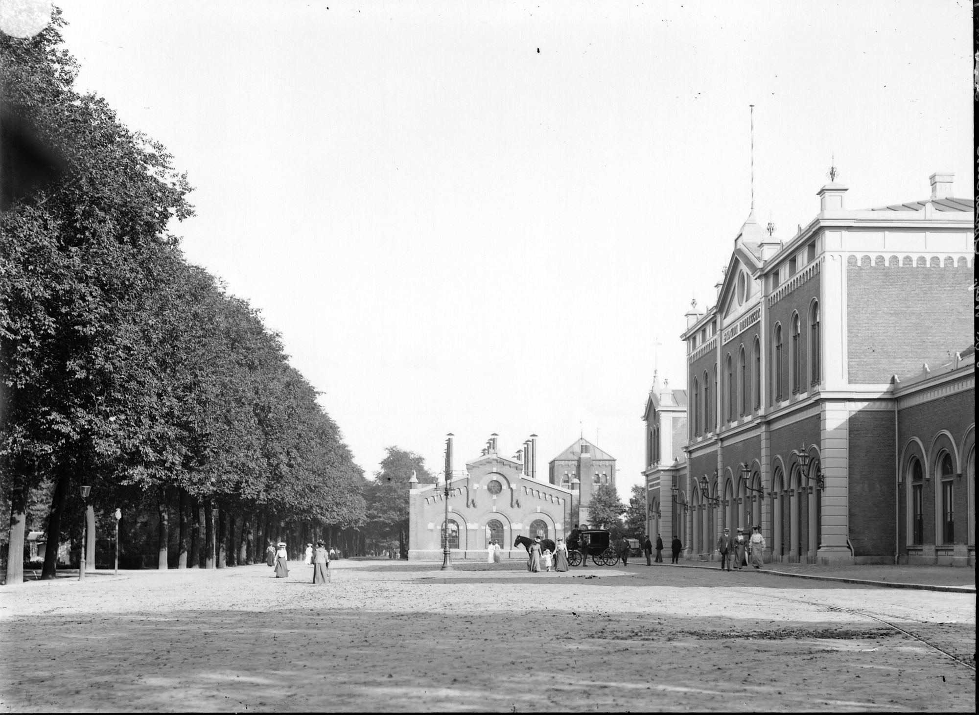 - De locomotievenloods (midden) en het station op het Stationsplein.