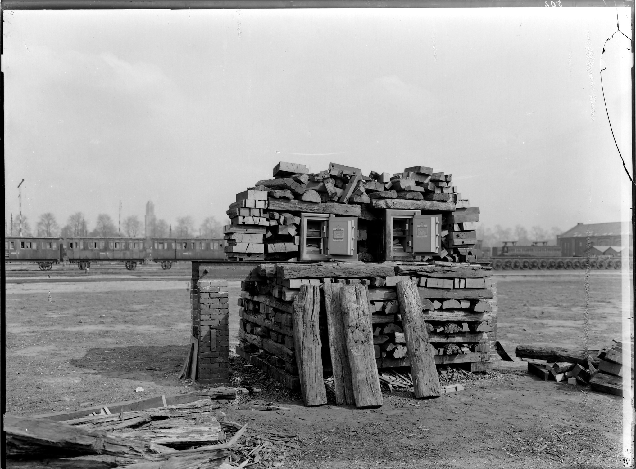 - Het testen voor brand en vallen van door Lips Brandkastenfabriek gefabriceerde kluizen op het terrein ten zuiden van de spoorbaan nabij de fabriek aan de Spuiweg (geheel rechts).