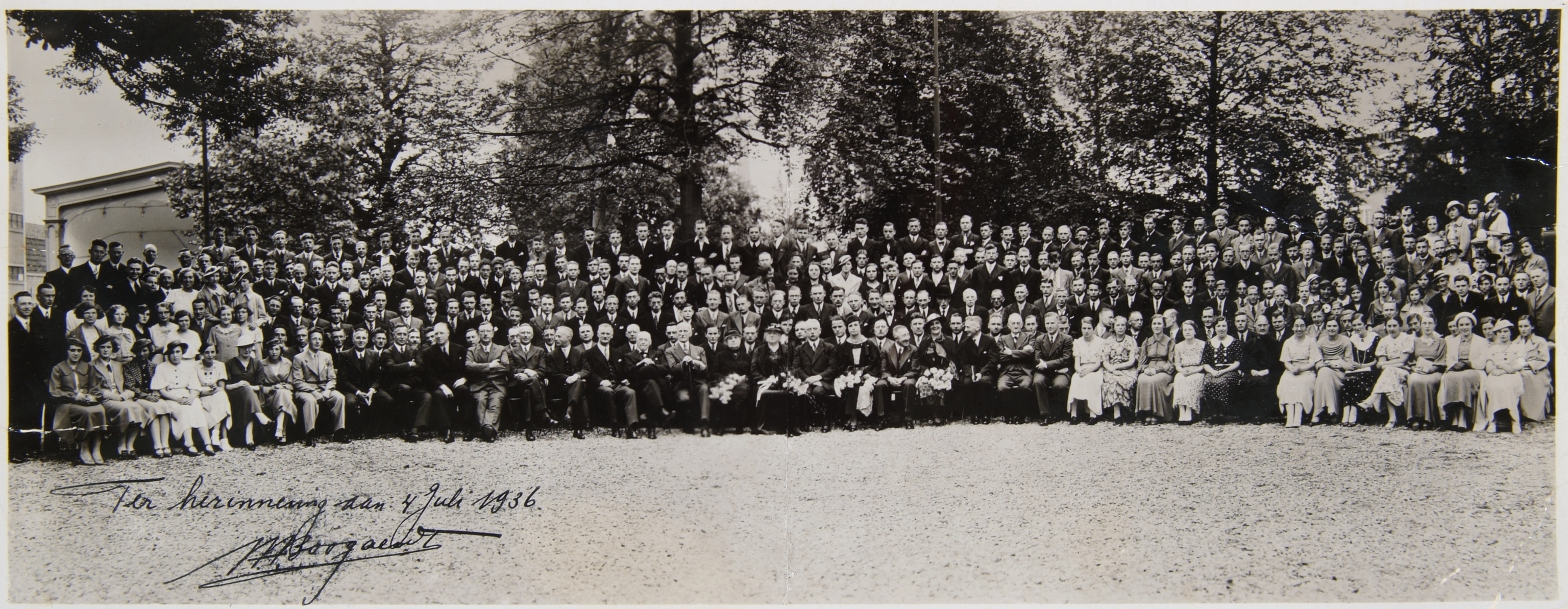 Personeel van EMF in de tuin van schouwburg Kunstmin bij de viering van het 25-jarig jubileum van directeur W. A. Boogaerdt. Links de muziektempel.