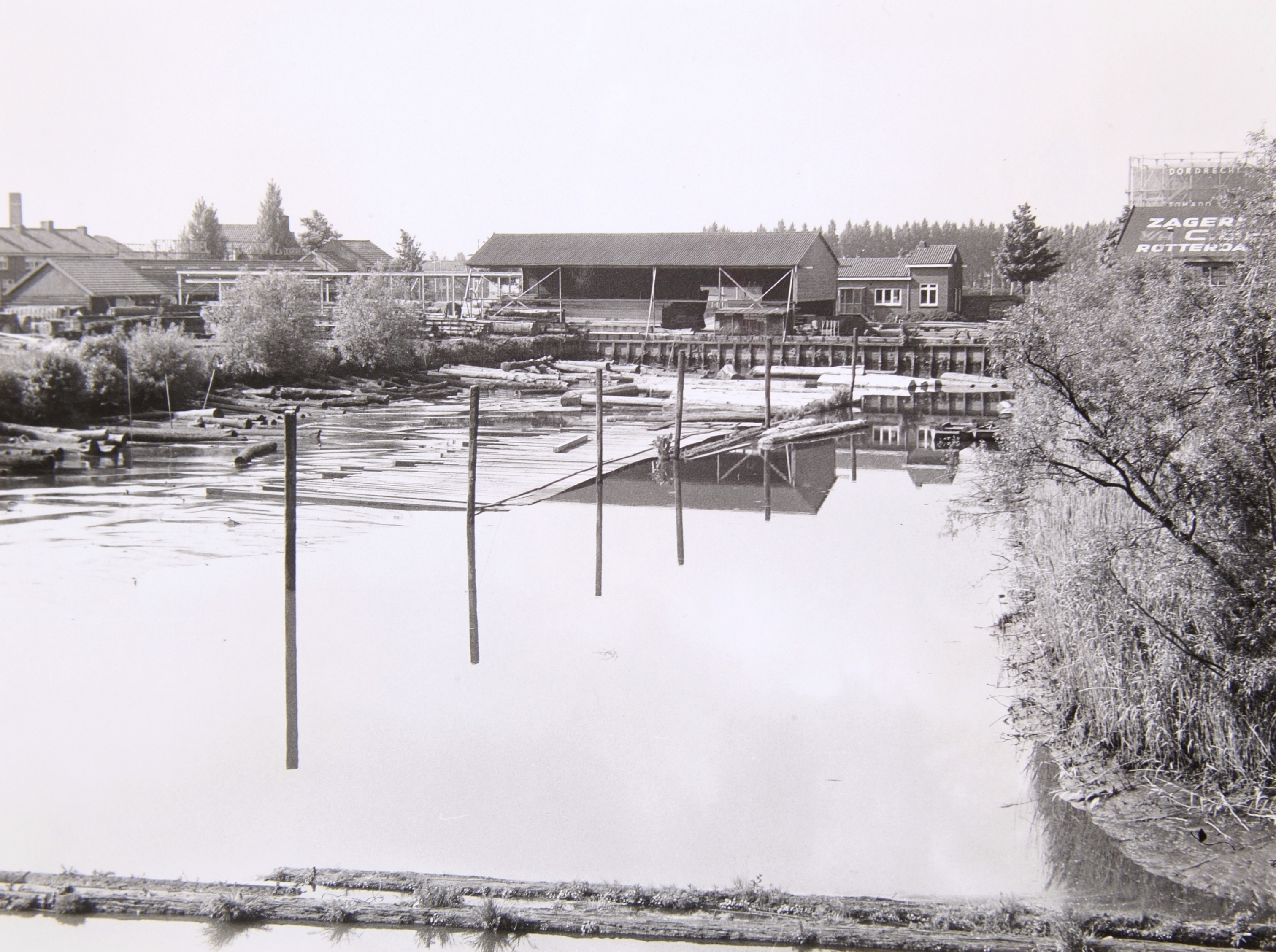 Het Papegat met boomstammen en houtvlotten bij houthandel Berger aan de Weeskinderendijk. Rechts op de achtergrond de gashouder aan de Mijlweg.