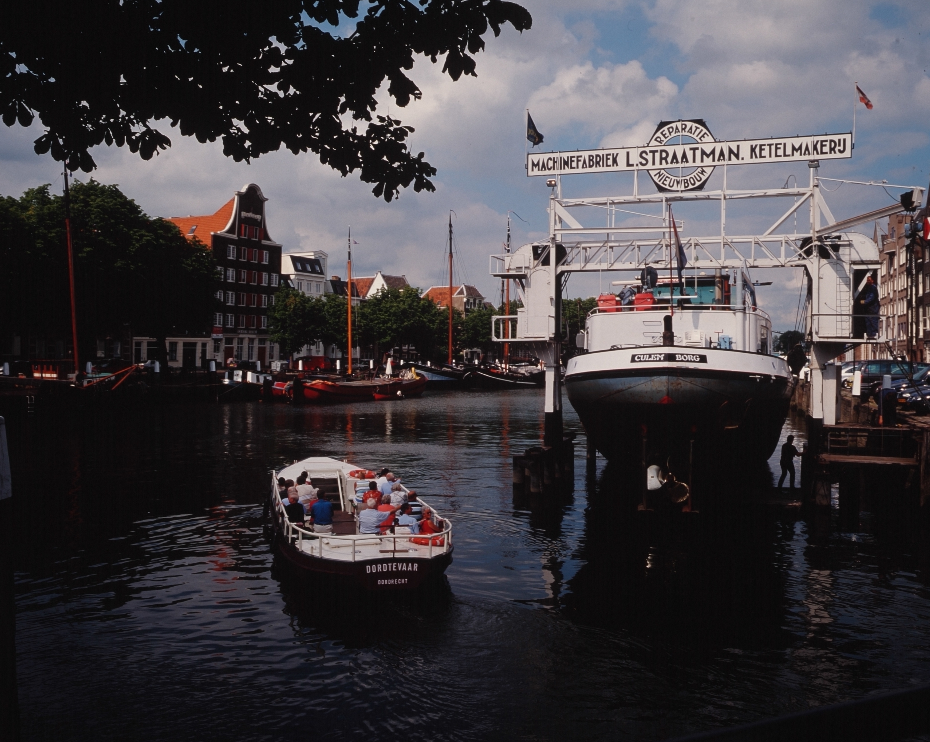 - Fluisterboot Dordtevaar in de Wolwevershaven en scheepslift van machinefabriek Straatman aan de Kuipershaven. Links pakhuis Stokholm.