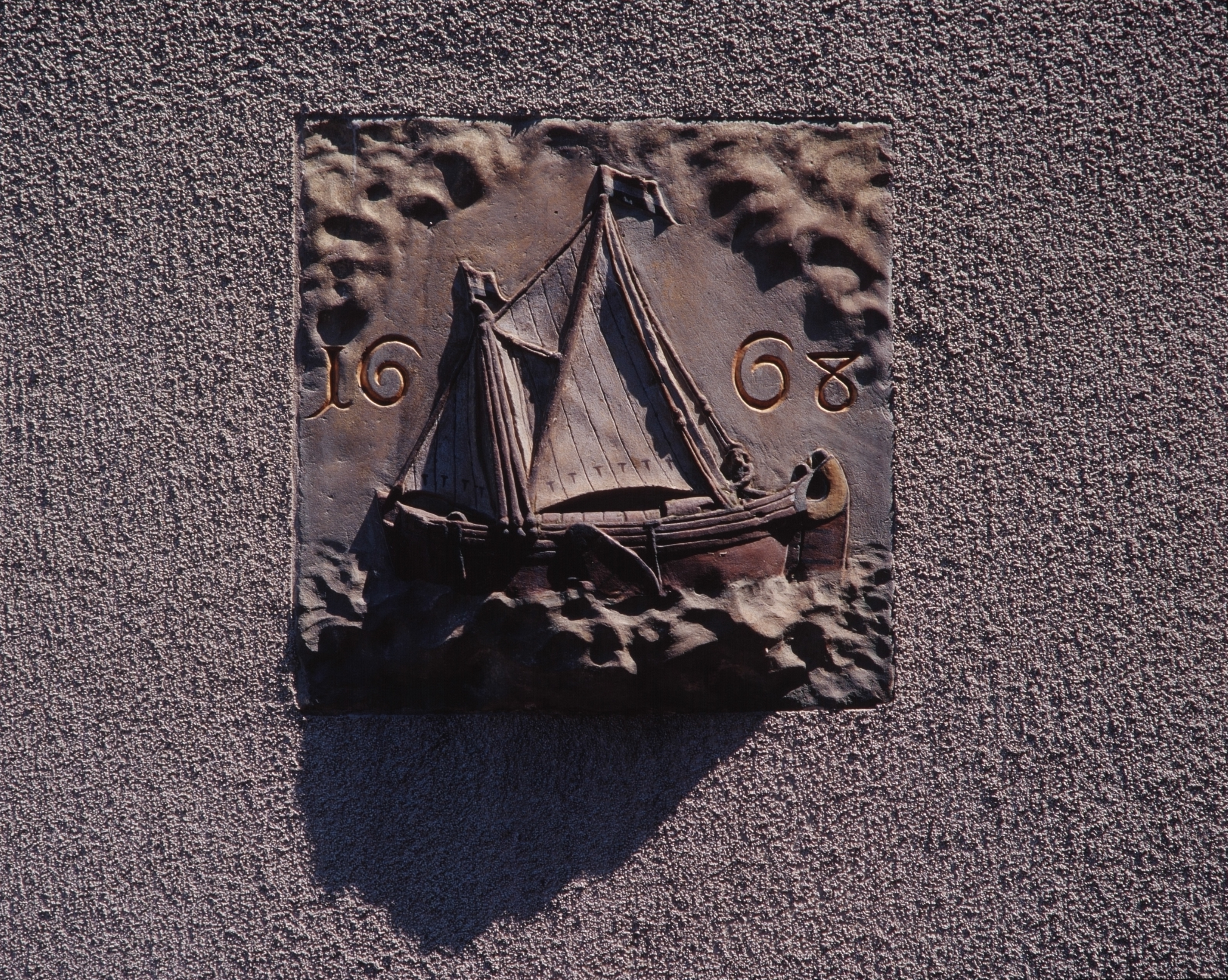 Gevelsteen met zeilende, vlaggende kaag met spriettuig en jaartal 1668, omstreeks 1973 …