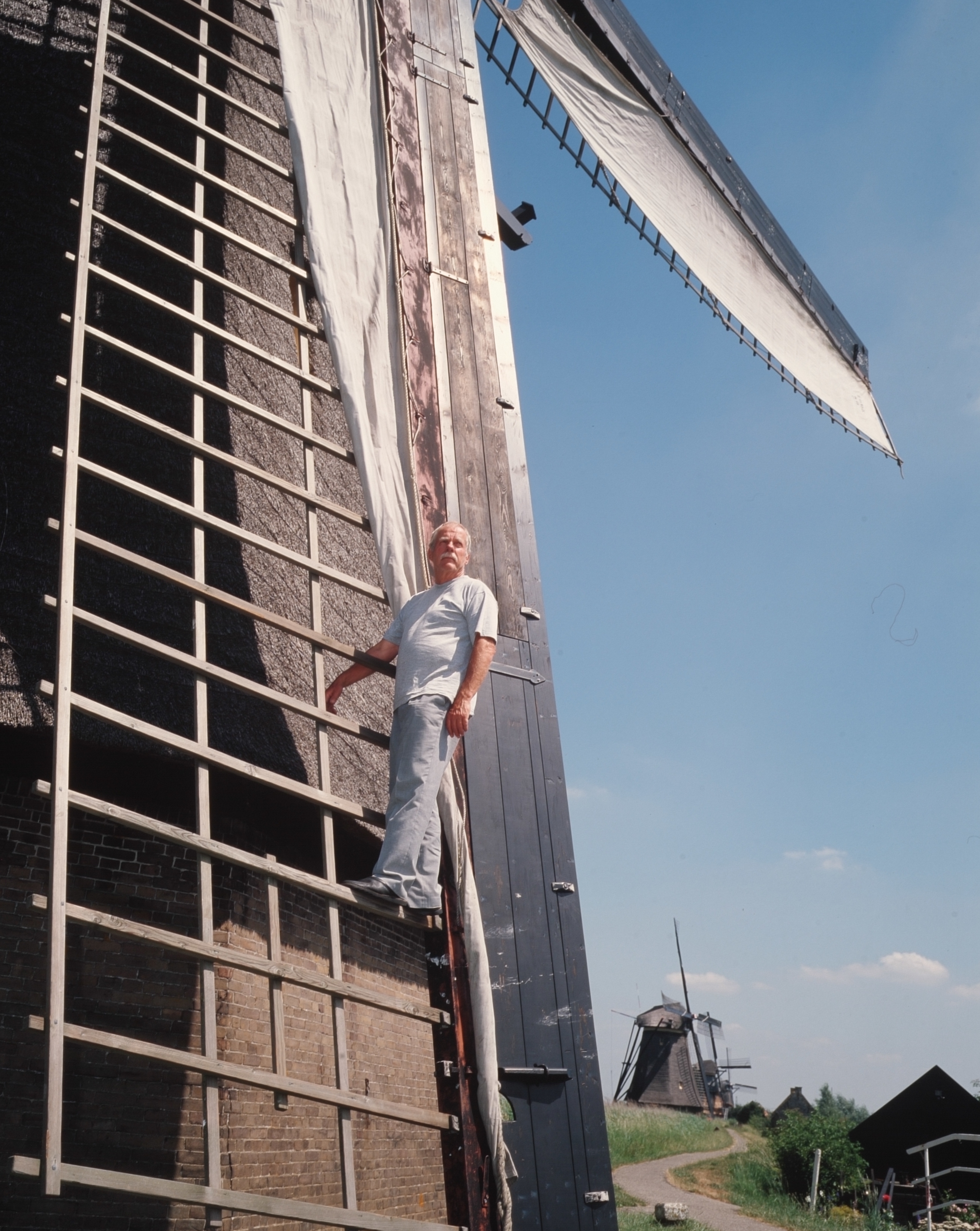 Molenaar Jaap de Vries op Molen Overwaard no. 4 aan de Molenkade Overwaard in Kinderdijk. Op de achtergrond de molens Overwaard no. 5, 6 en 7.