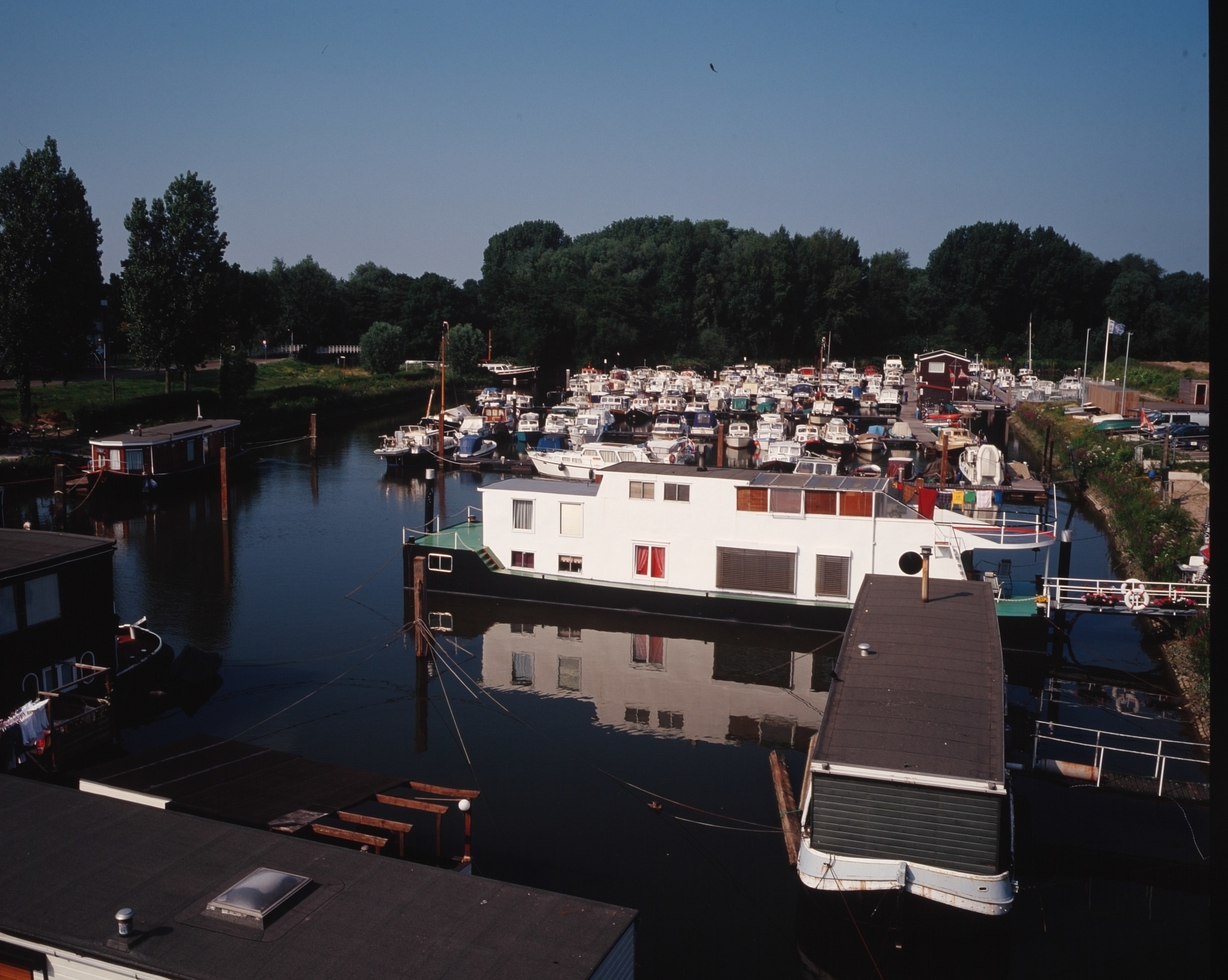 Jachten en woonarken in de Vlijhaven langs de Baden-Powelllaan (links), gezien vanaf de …