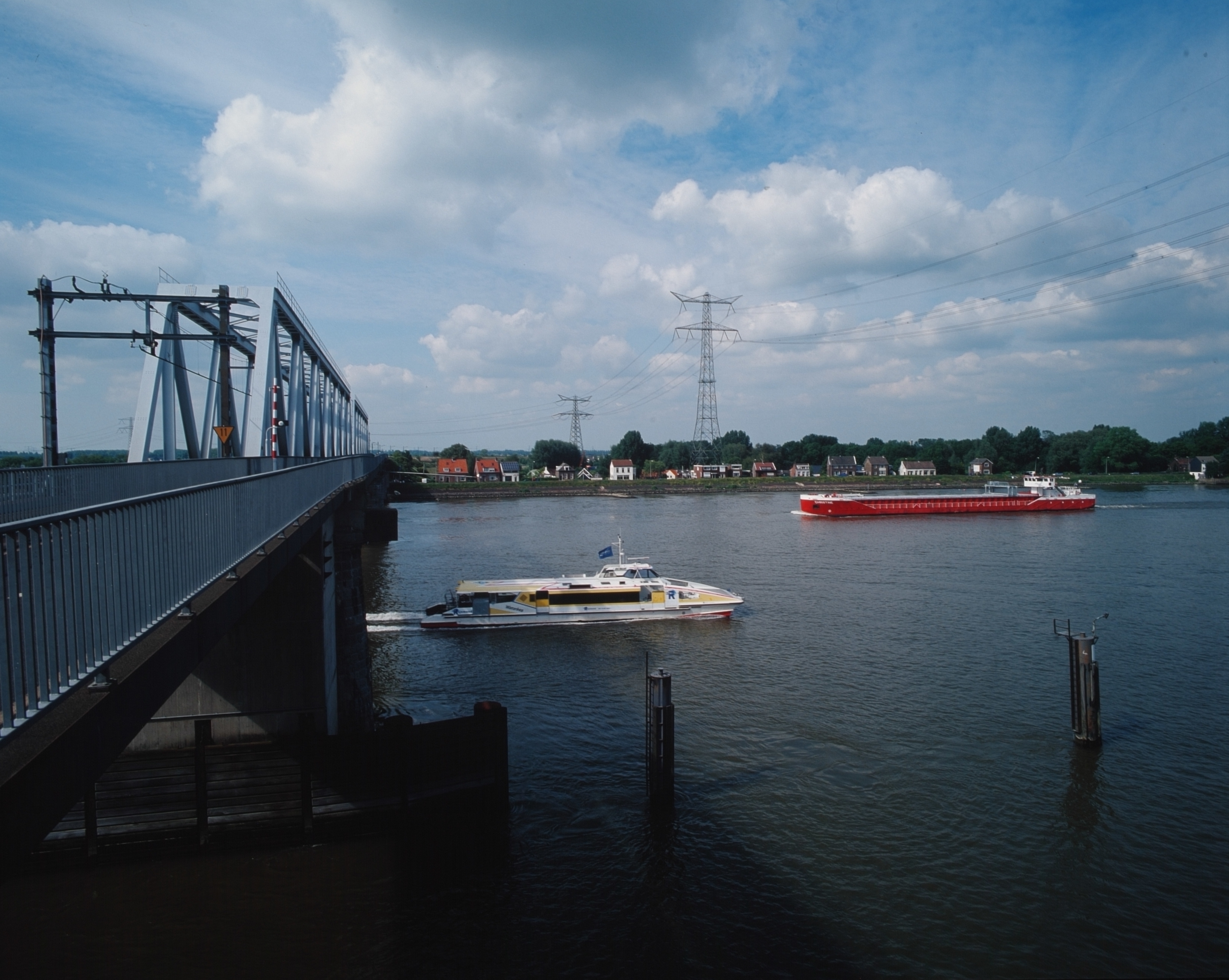 De Baanhoekbrug over de Merwede in de richting van de Baanhoek in Sliedrecht. Rechts …