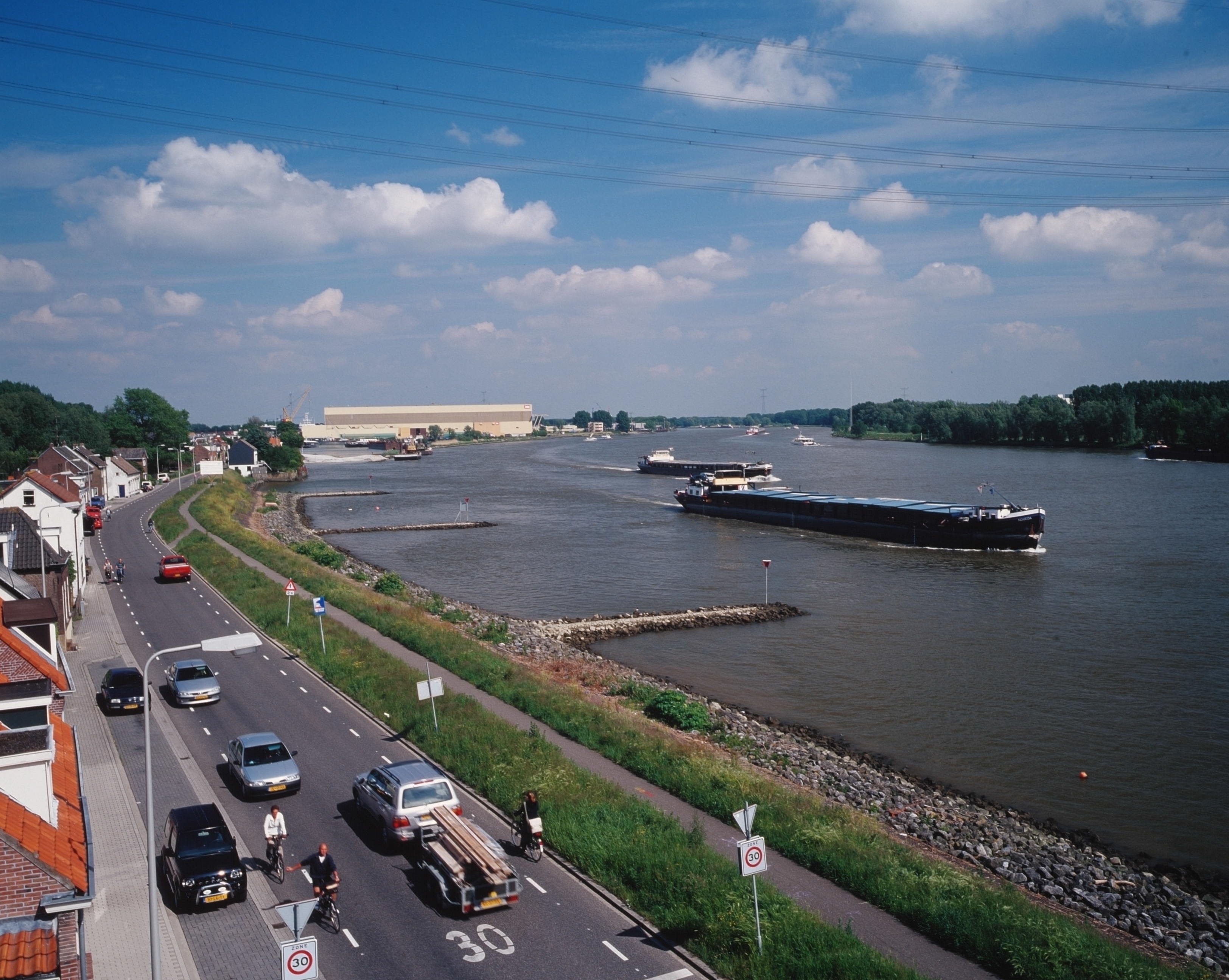 De Baanhoek in Sliedrecht vanaf de Baanhoekbrug in oostelijke richting. Op de achtergrond scheepswerf IHC.