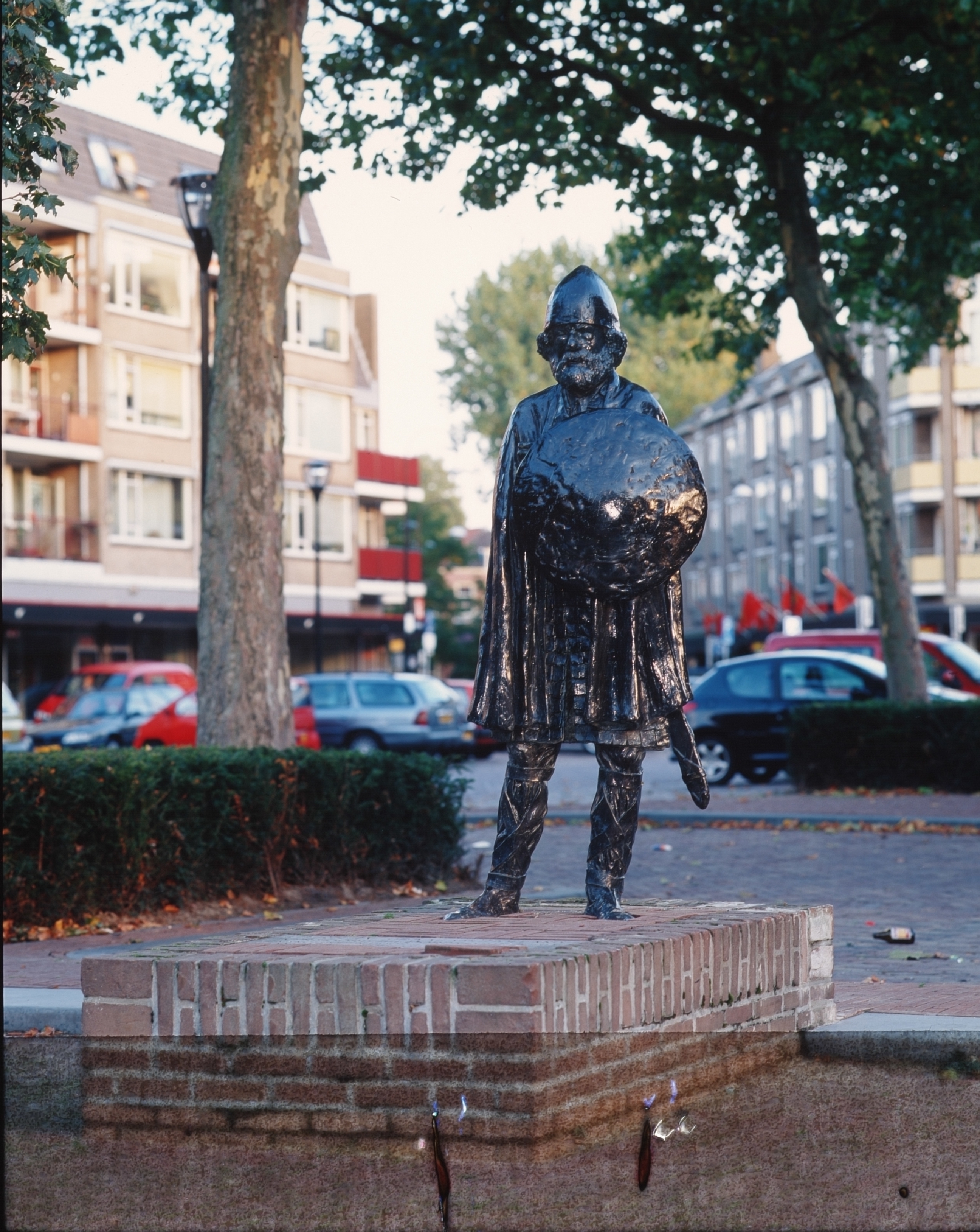 - Beeld van Dirk IV ontworpen door Jan Haas op de Varkenmarkt, de Grote Markt op de achtergrond.