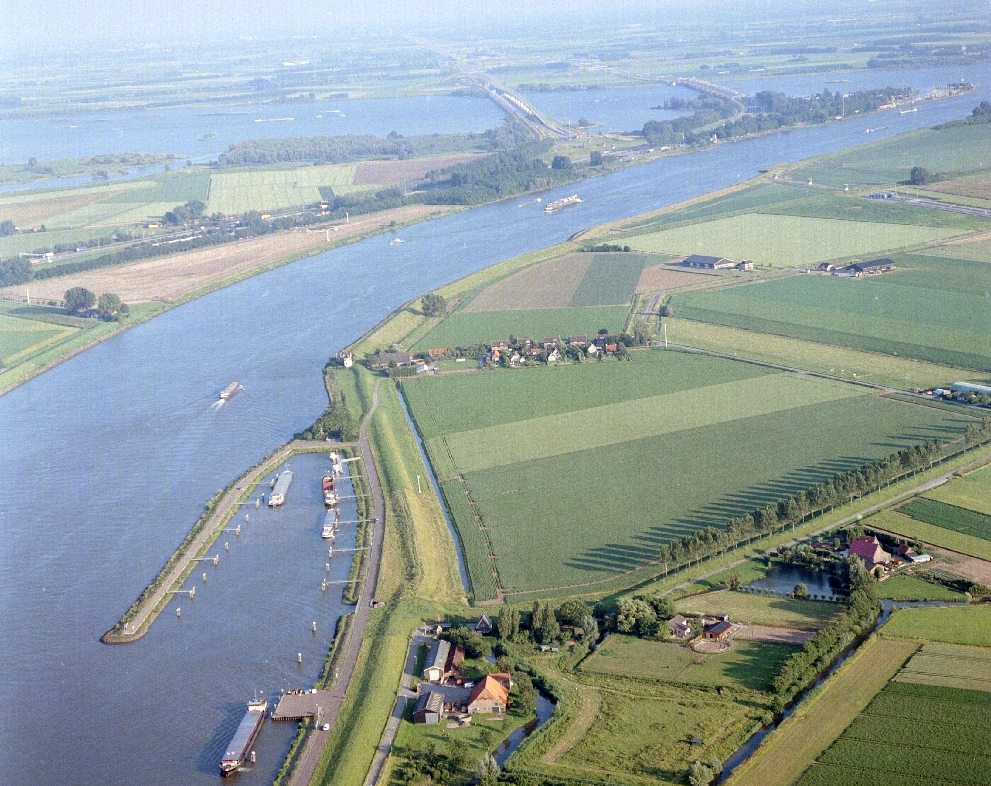 - Luchtfoto vanaf De Wacht in 's-Gravendeel over de Dordtsche Kil richting het Hollandsch Diep met de Moerdijkbruggen. Geheel rechts boven het midden is de ingang van de spoortunnel van de Hogesnelheidslijn onder de Kil te zien.