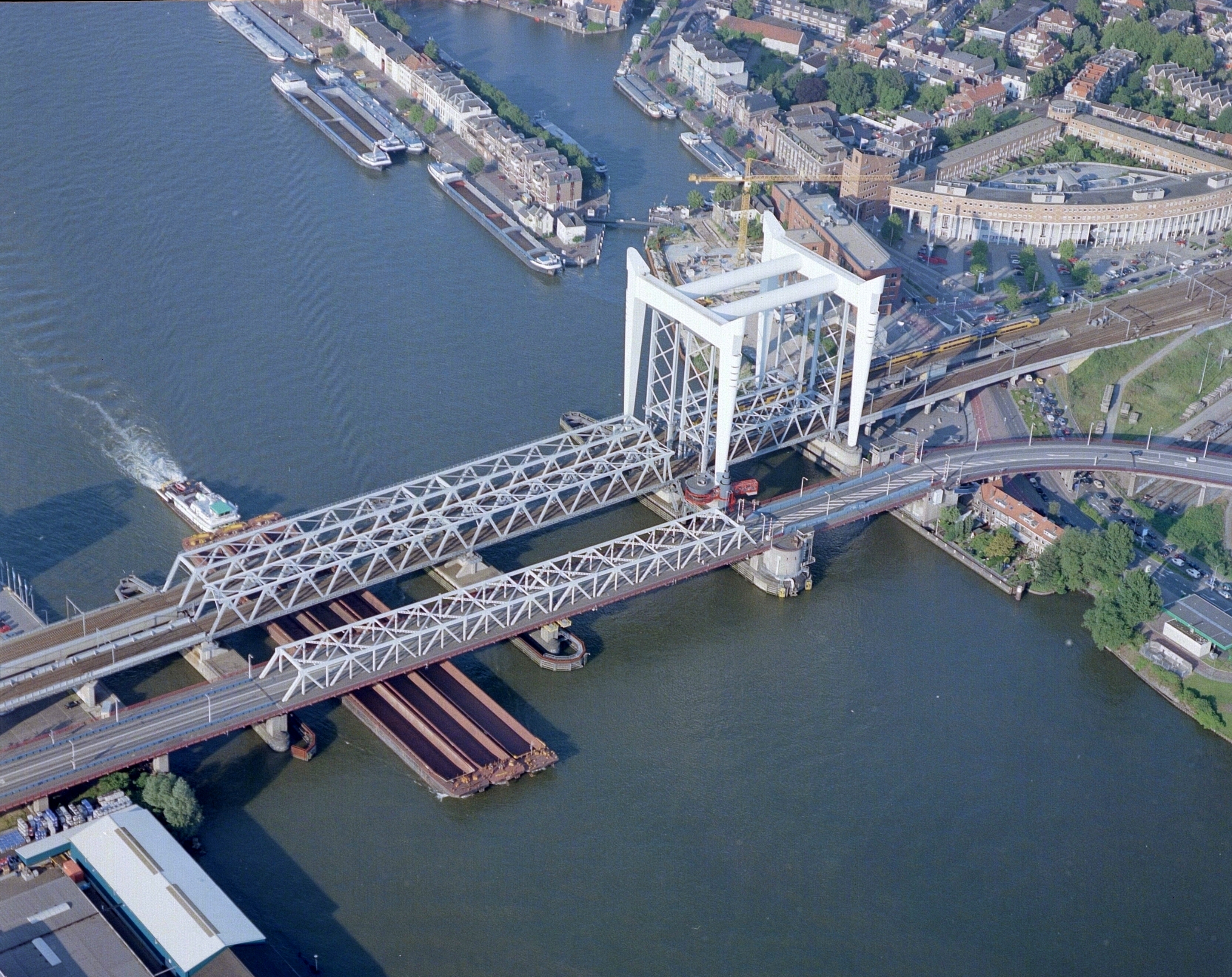 - duwbakken luchtfoto's spoorbruggen verkeersbruggen vrachtboten