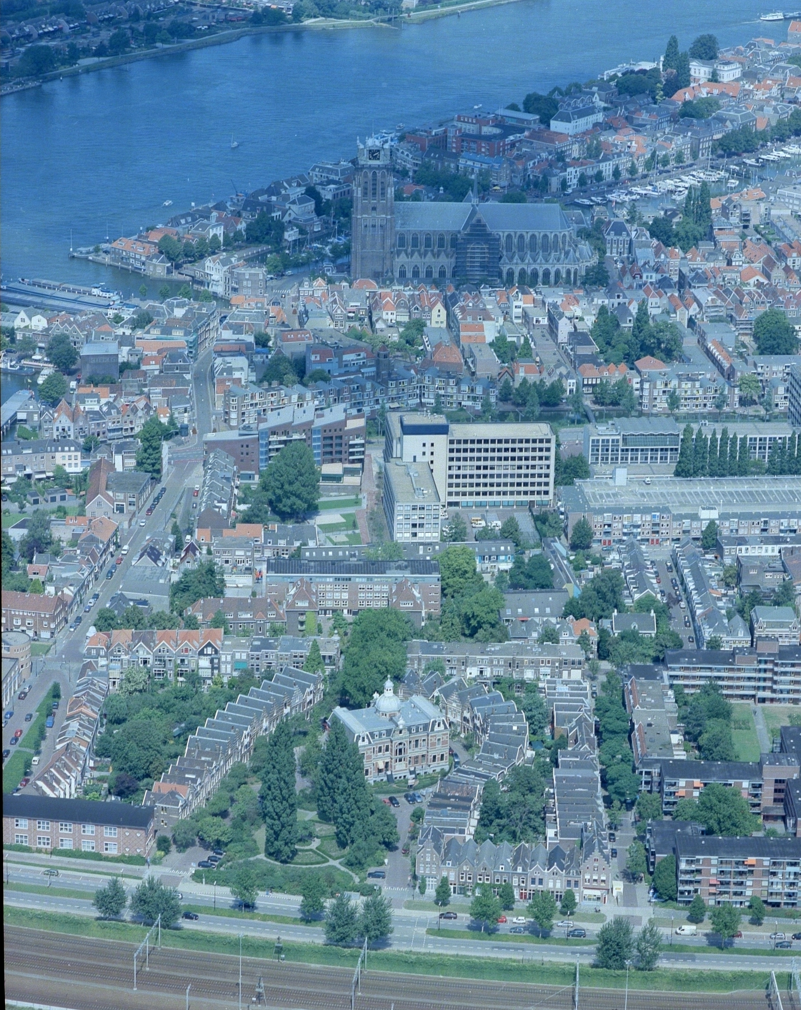 - Luchtfoto vanaf de spoorbaan langs de Havenstraat en Rozenhof naar het noorden. Bovenin de Grote Kerk.