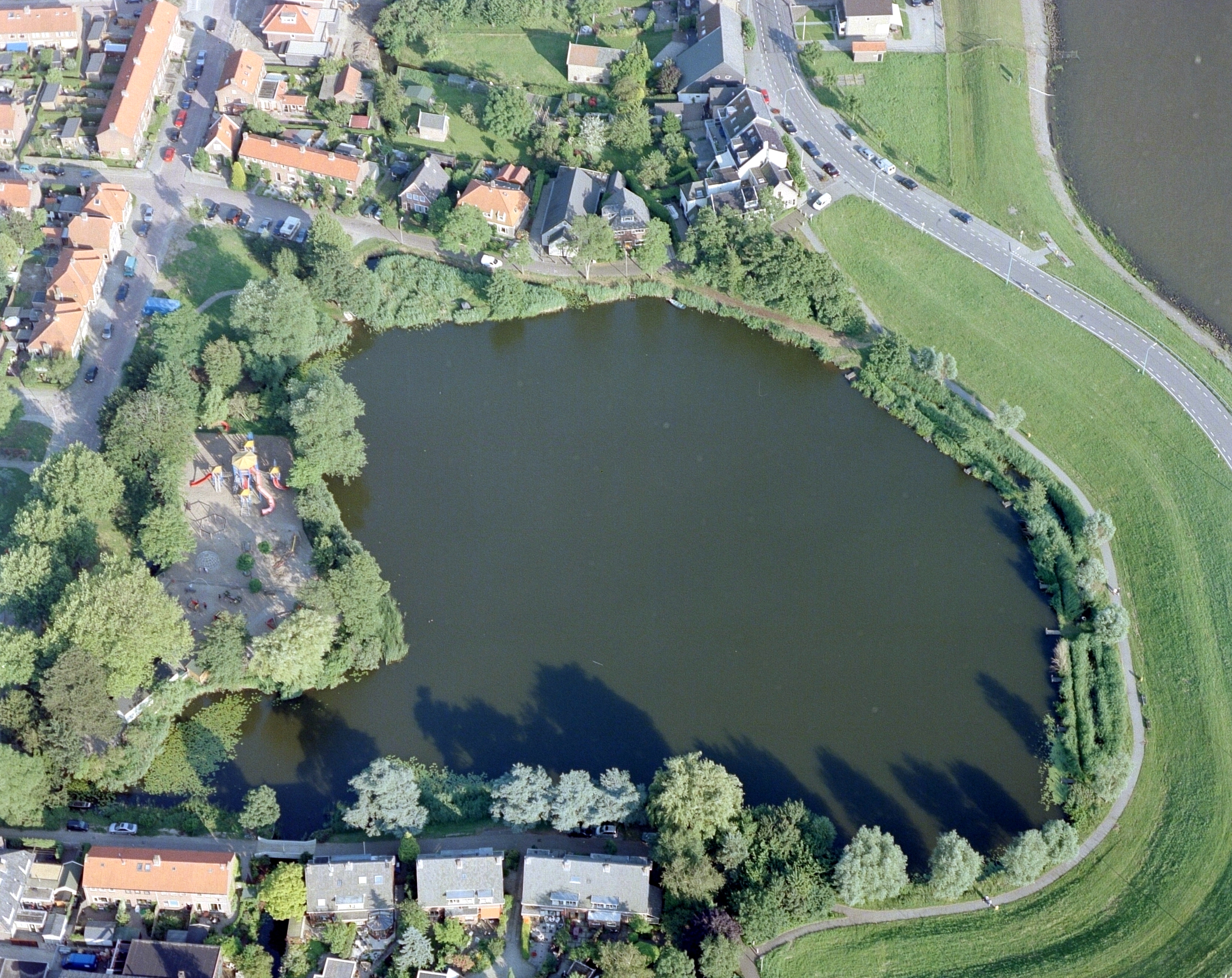 - Luchtfoto van het Rijzenwiel aan de West Kinderdijk in Alblasserdam. Recht de Noord.
