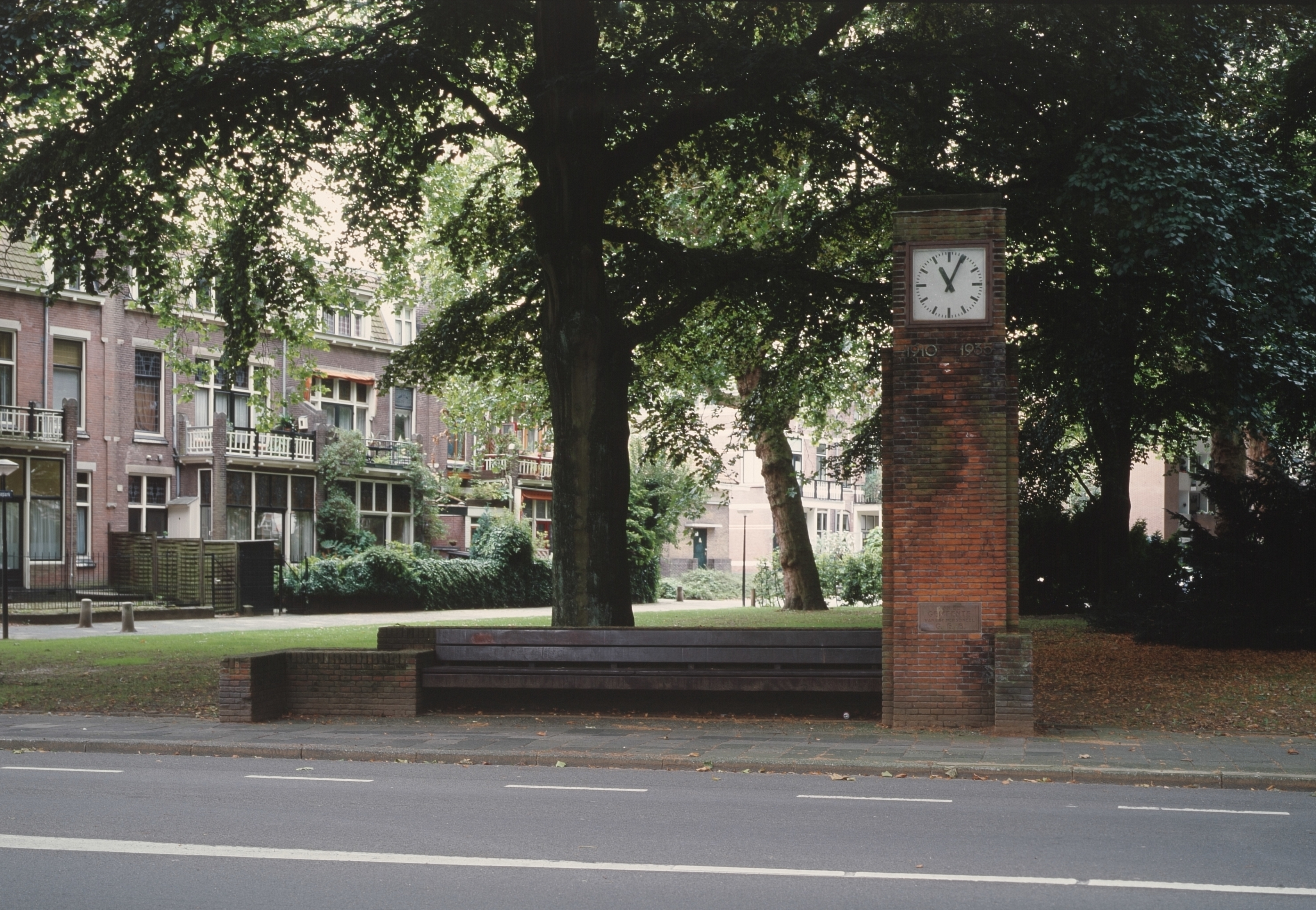 Stenen bank met elektrische klok op de Vrieseweg aan de rand van het Oranjepark. De …