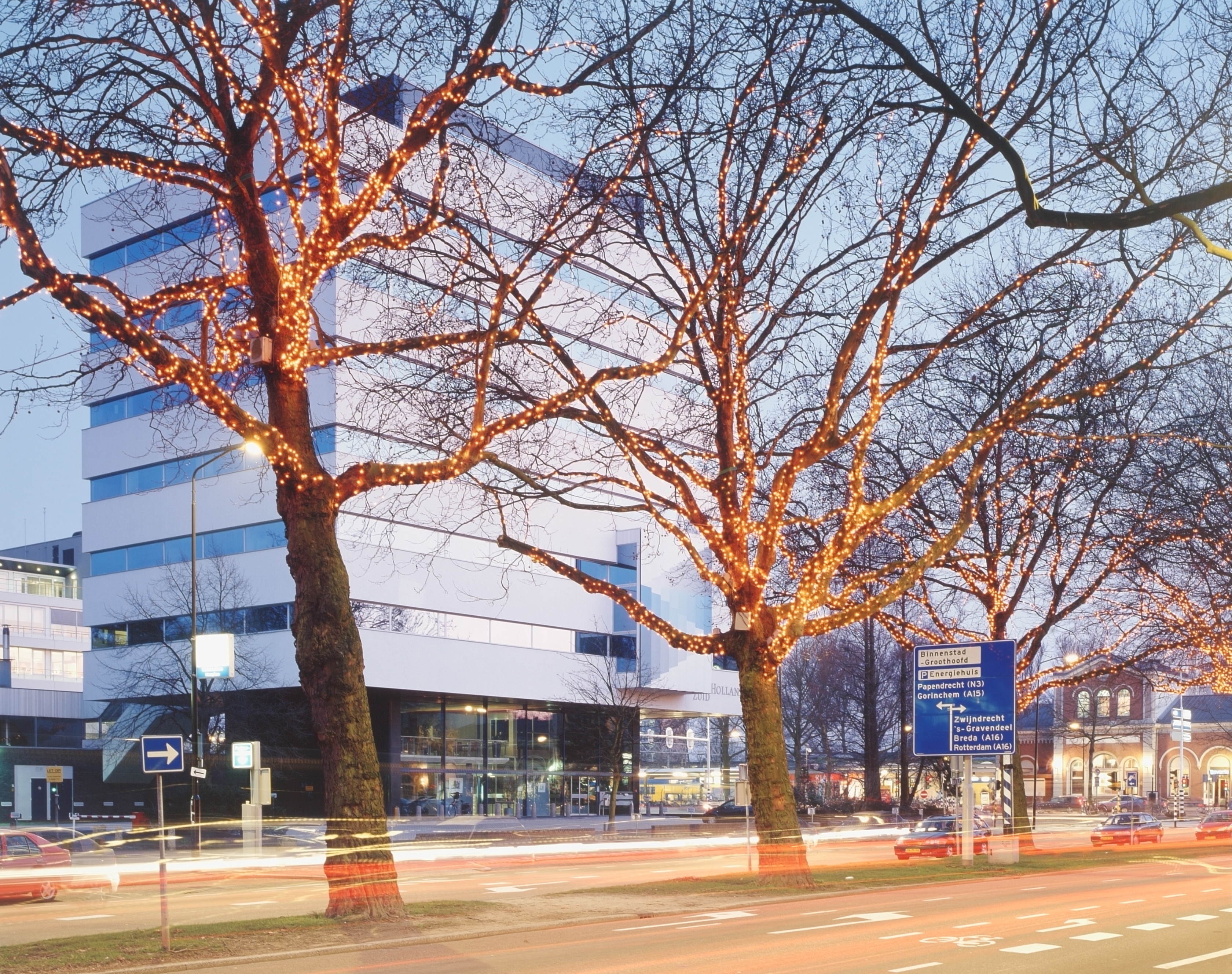 - bomen feestverlichting kantoorgebouwen richtingborden / wegwijzers stations(gebouwen)