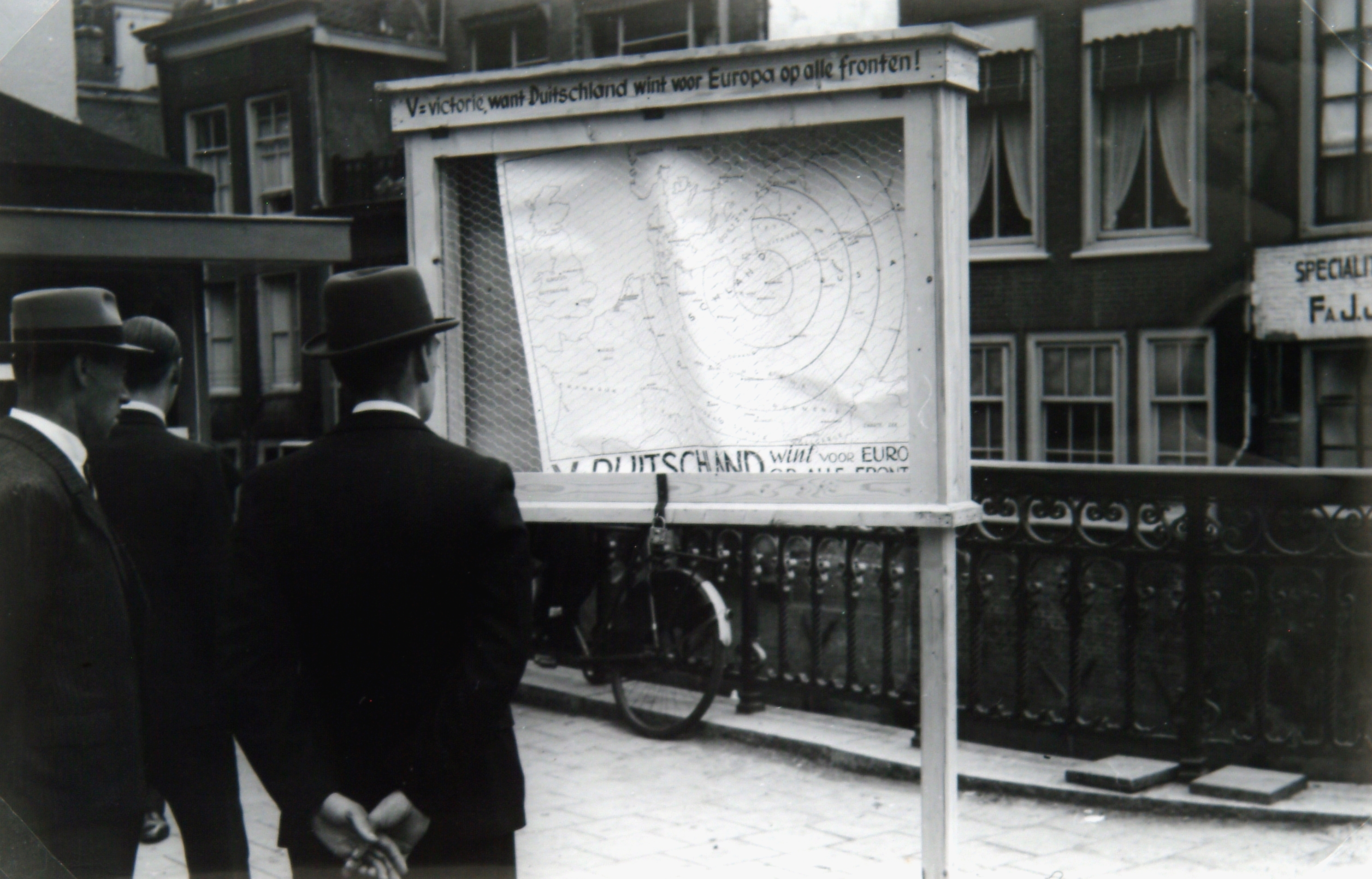 De Voorstraat hoek Visbrug (tegenover Overwijn) tijdens de Tweede Wereldoorlog. Links …