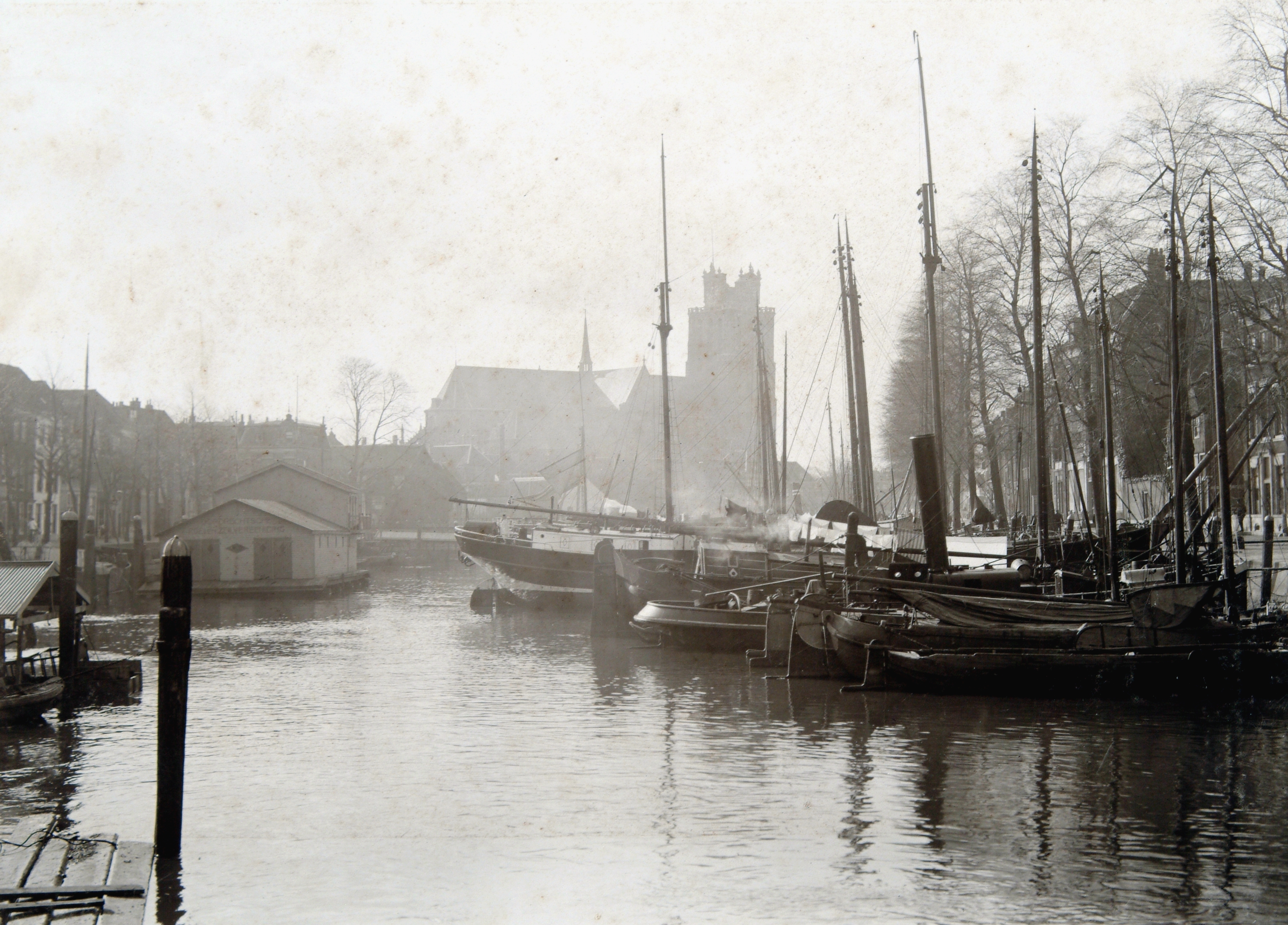 De Nieuwe Haven vanaf de Aardappelmarkt richting Grote Kerk. Links de Knolhaven met het botenhuis van de roei- en zeilvereniging. Geheel links een stukje van het visvlot.