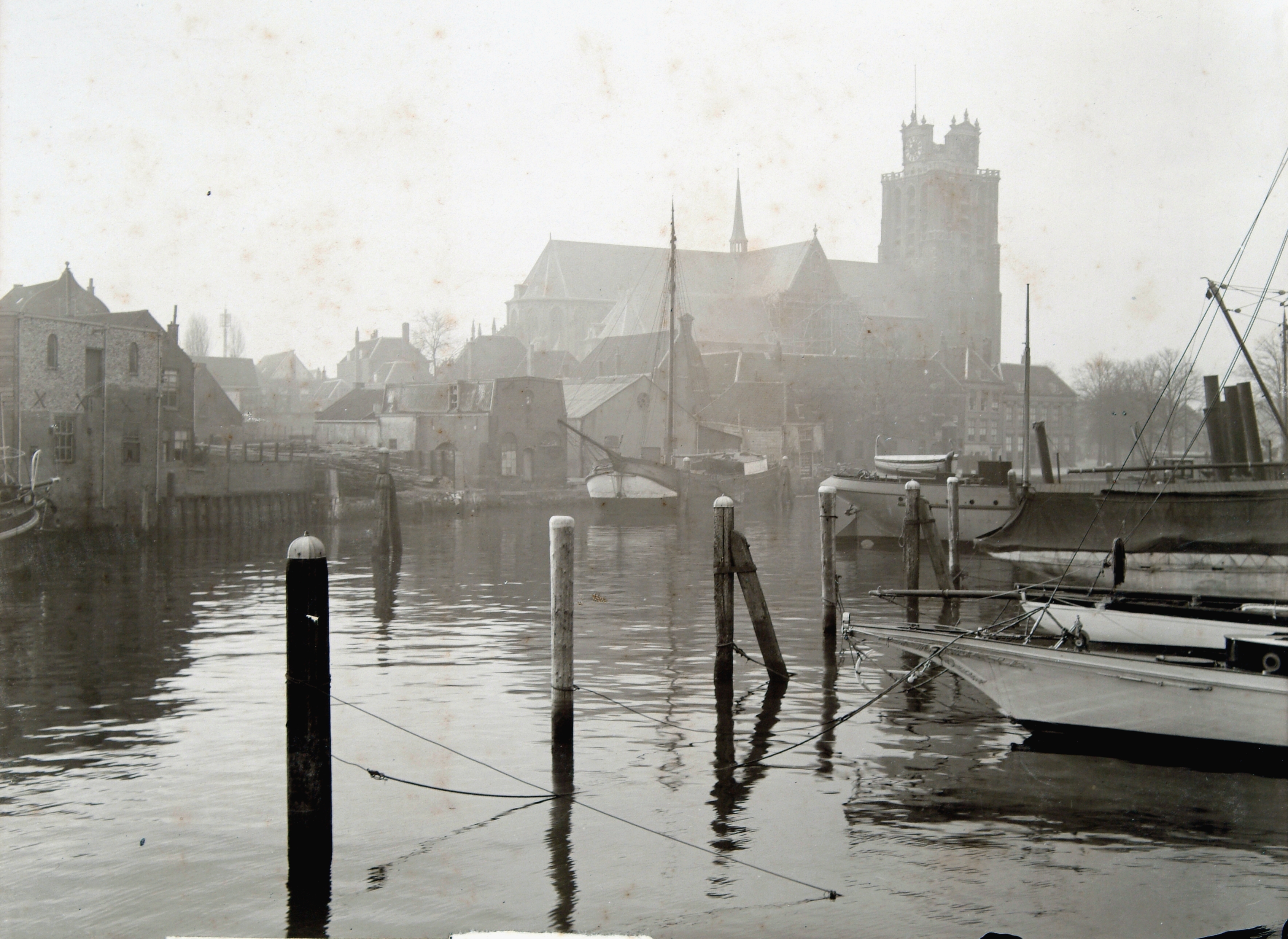- De Nieuwe Haven vanaf Lange IJzerenbrug richting Grote Kerk. Links de Houttuinen met het rijksmagazijn midden voor de kerk.