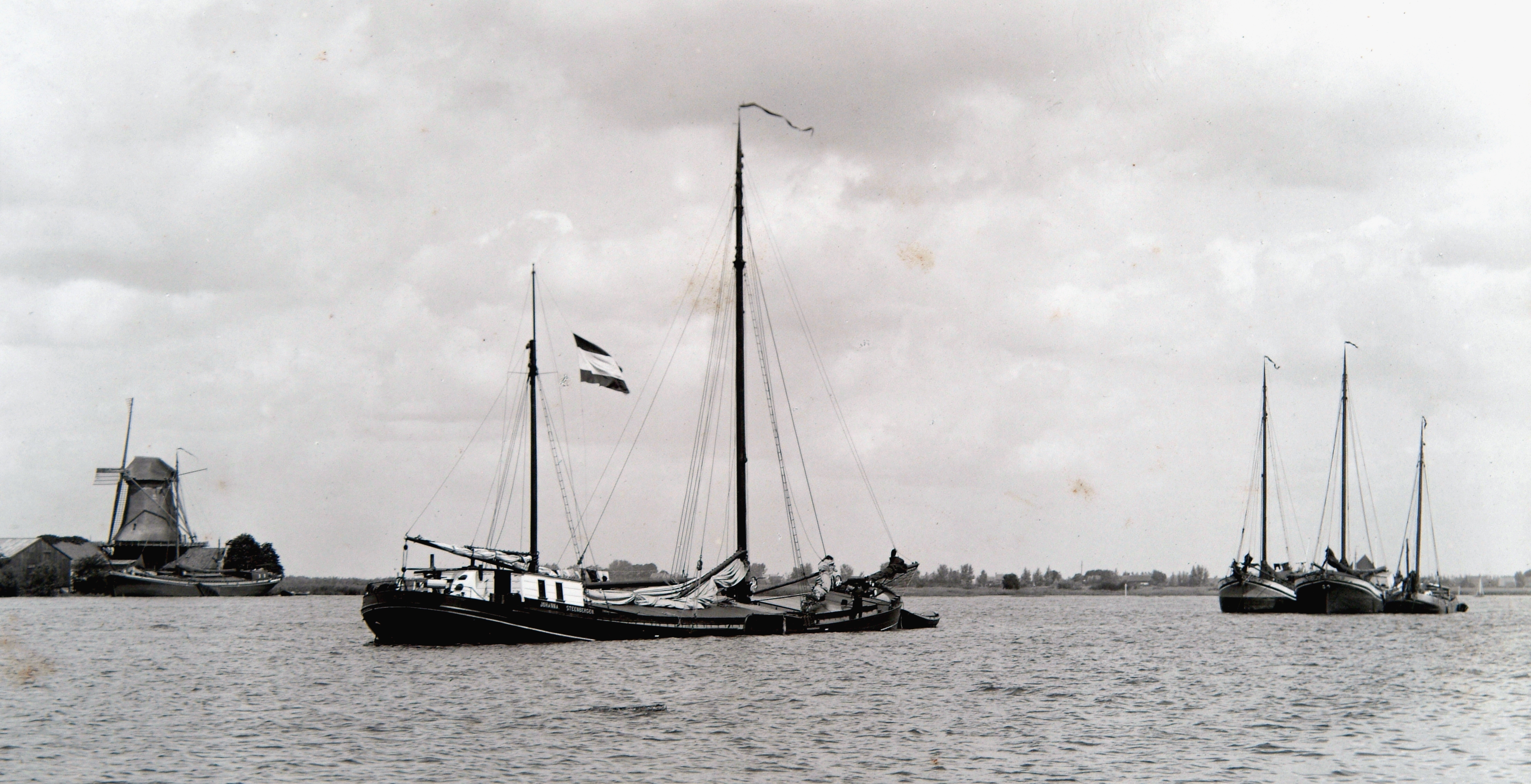 Vrachtzeilschepen op de Oude Maas. Molen Welgelegen in Zwijndrecht.