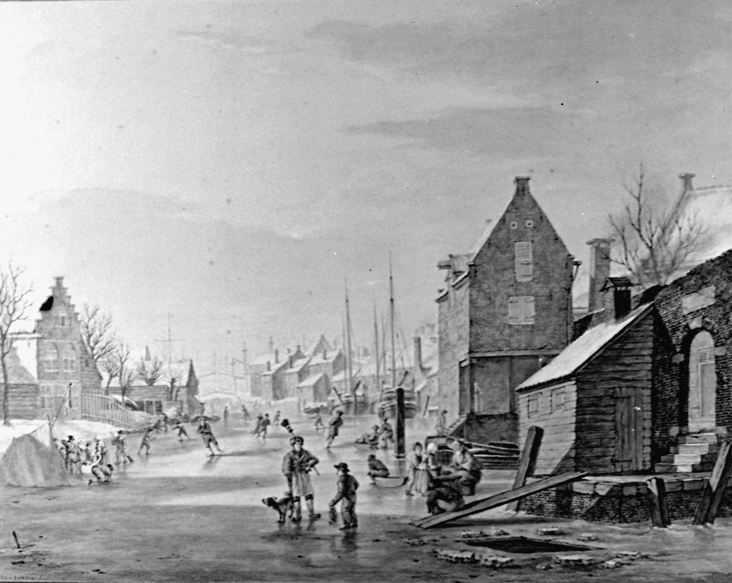 - Tekening van bevroren Spuihaven richting de Zuidersluisbrug. Links de Hellingen en rechts een stuk stadsmuur met poort in de Boogjes, verderop het Slikveld.