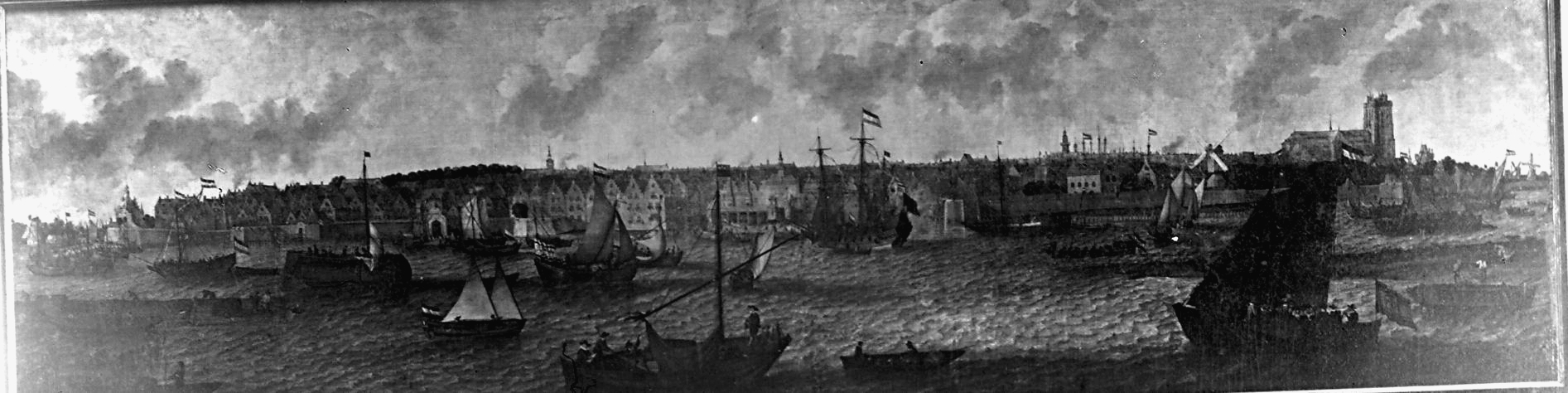 - Schilderij van gezicht op Dordrecht over de Oude Maas.