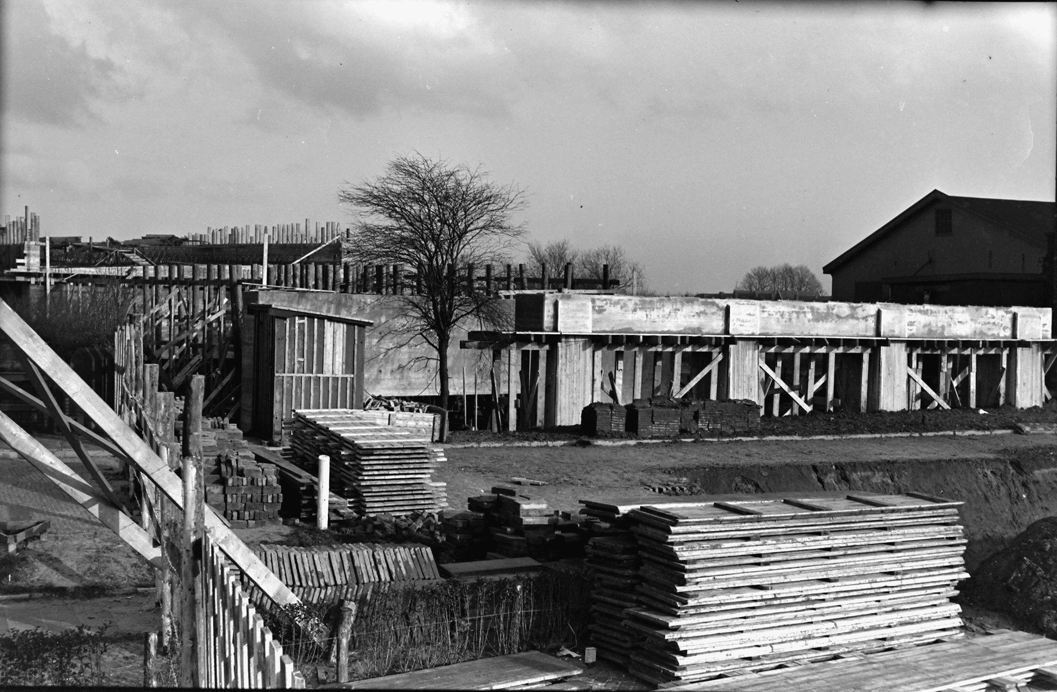 Bouw van de oprit van de verkeersbrug naar Zwijndrecht op de Weeskinderendijk.