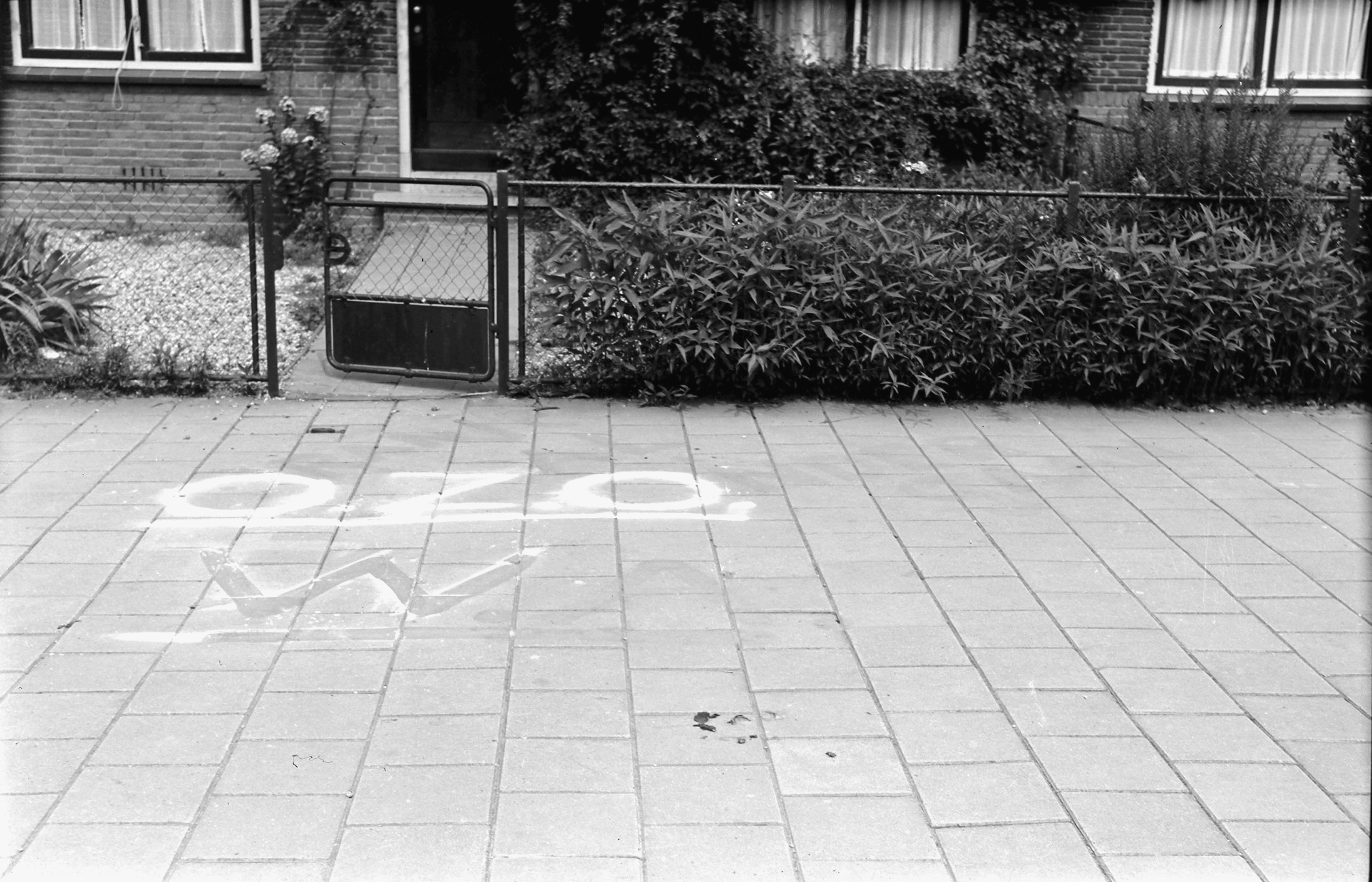 Op het trottoir van Reeweg Oost bij de hoek van de Ceramstraat staat OZO gekalkt, een …