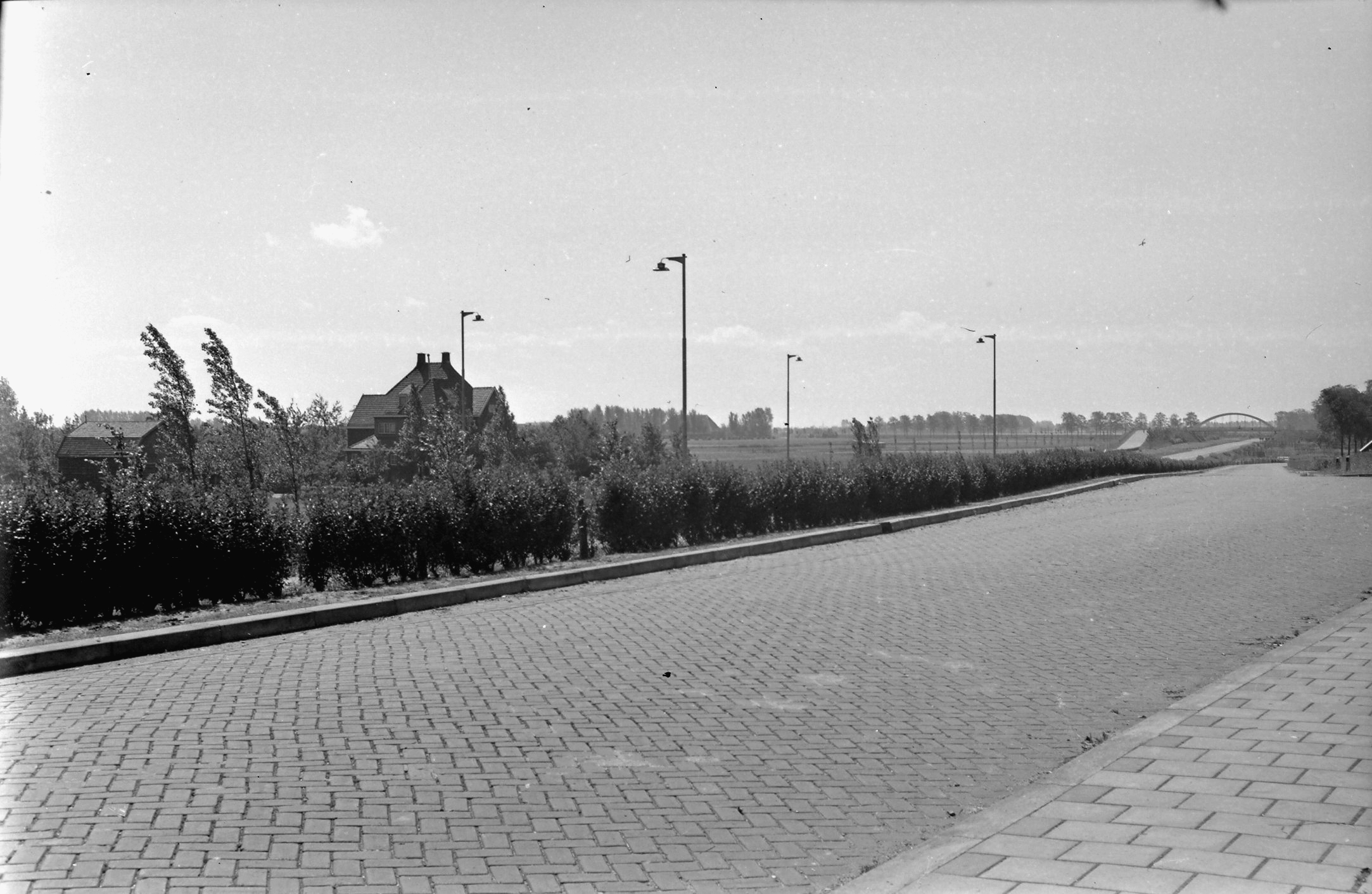 De boogbrug in de verte is inmiddels vervangen (Simon de Danserweg). Afbeelding 552_315657 geeft een redelijk beeld van de situatie. Langs de bovenrand ter hoogte van de bomenrij is de Rijksstraatweg. Achter die bomen, net iets rechts van de schoorsteen van de stikstoffabriek zien we Merelhof. Vooral het bijgebouw is goed te herkennen. Tegenover Merelhof de voor de A16 opgeofferde boerderij.