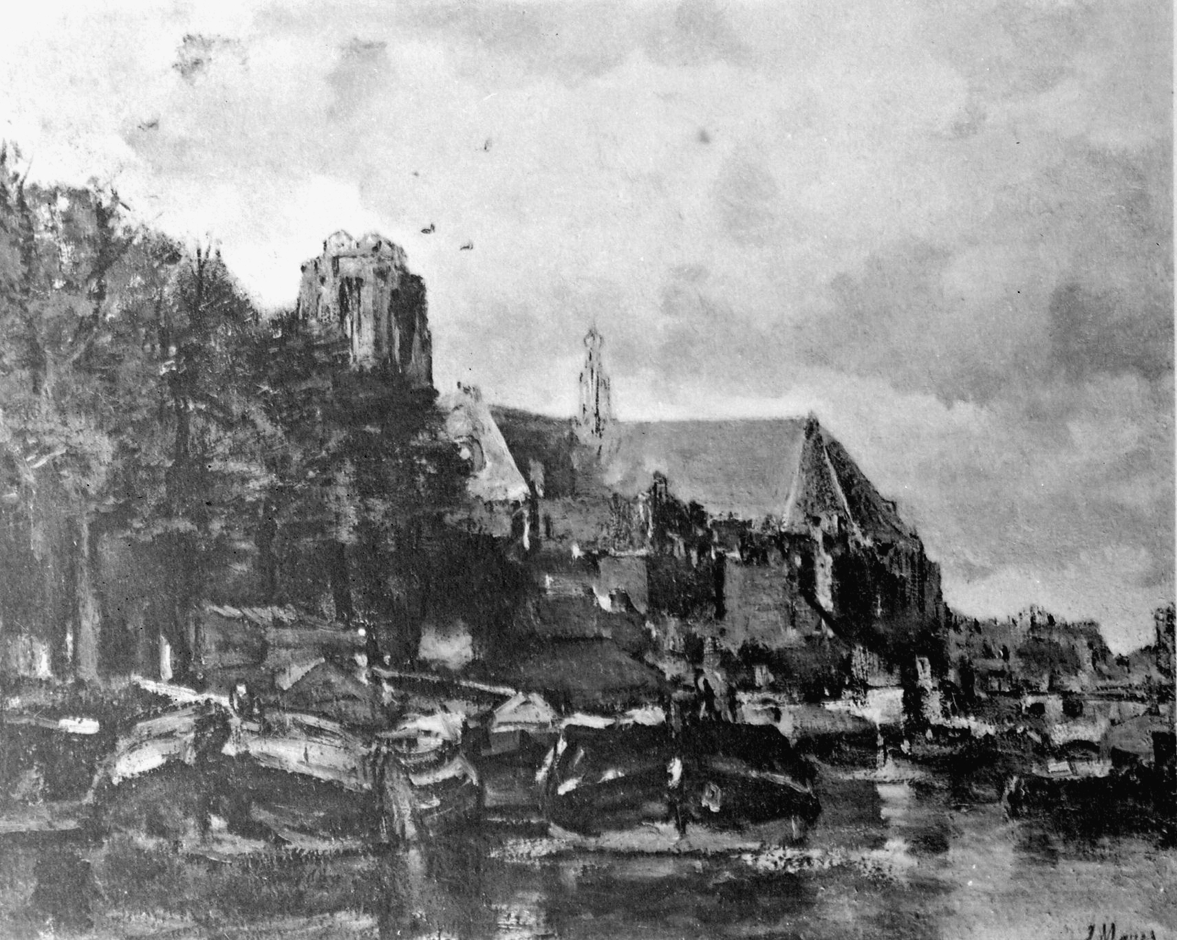 - Tekening van boten in de Voorstraatshaven bij de Pottenkade en de Grote Kerk, gezien naar het oosten.