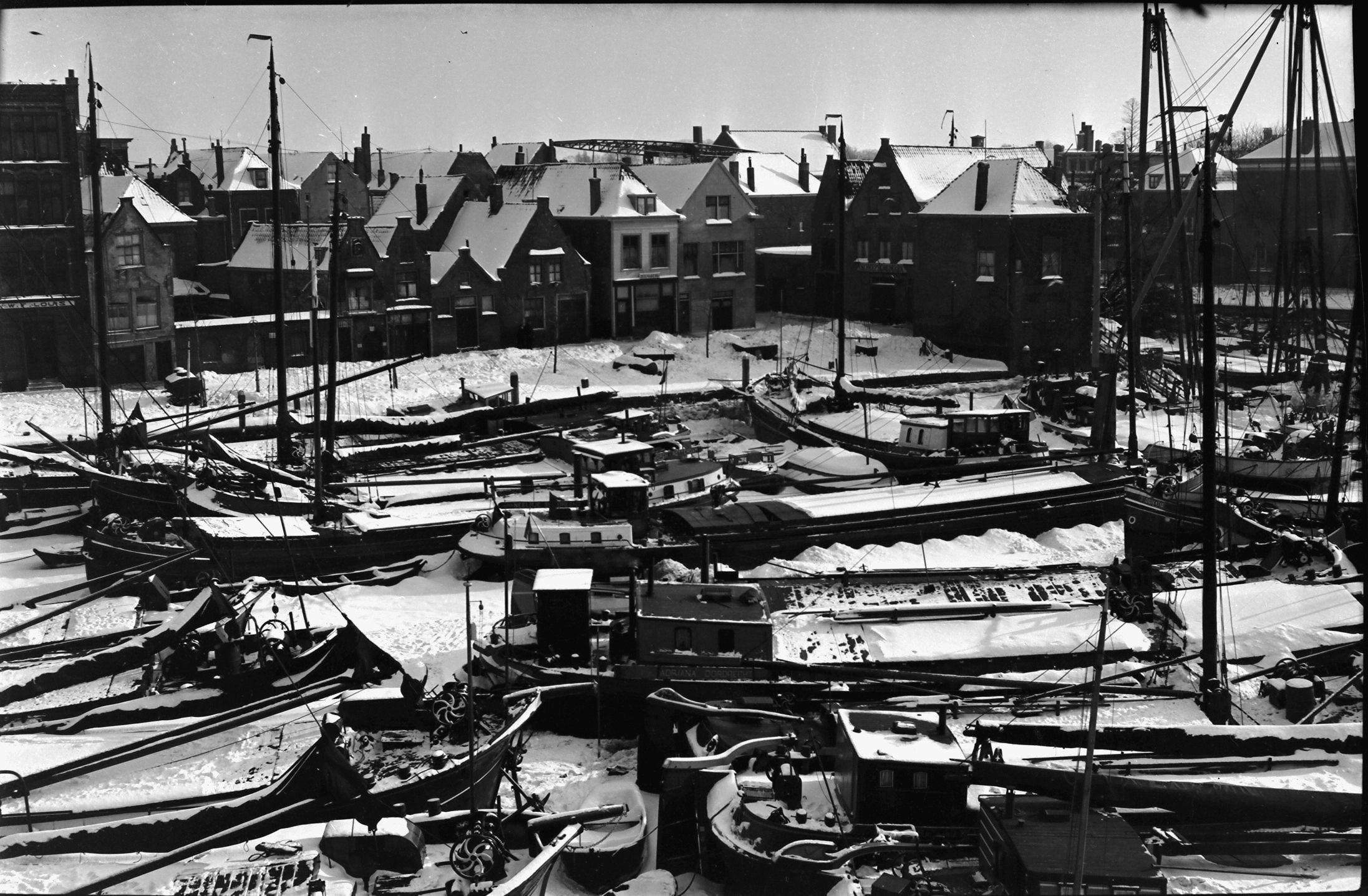 - Winterse Kalkhaven richting Keizershof, Kleine Kalkstraat en Achterhakkers. Op de achtergrond in het midden is de Zuidersluisbrug zichtbaar.