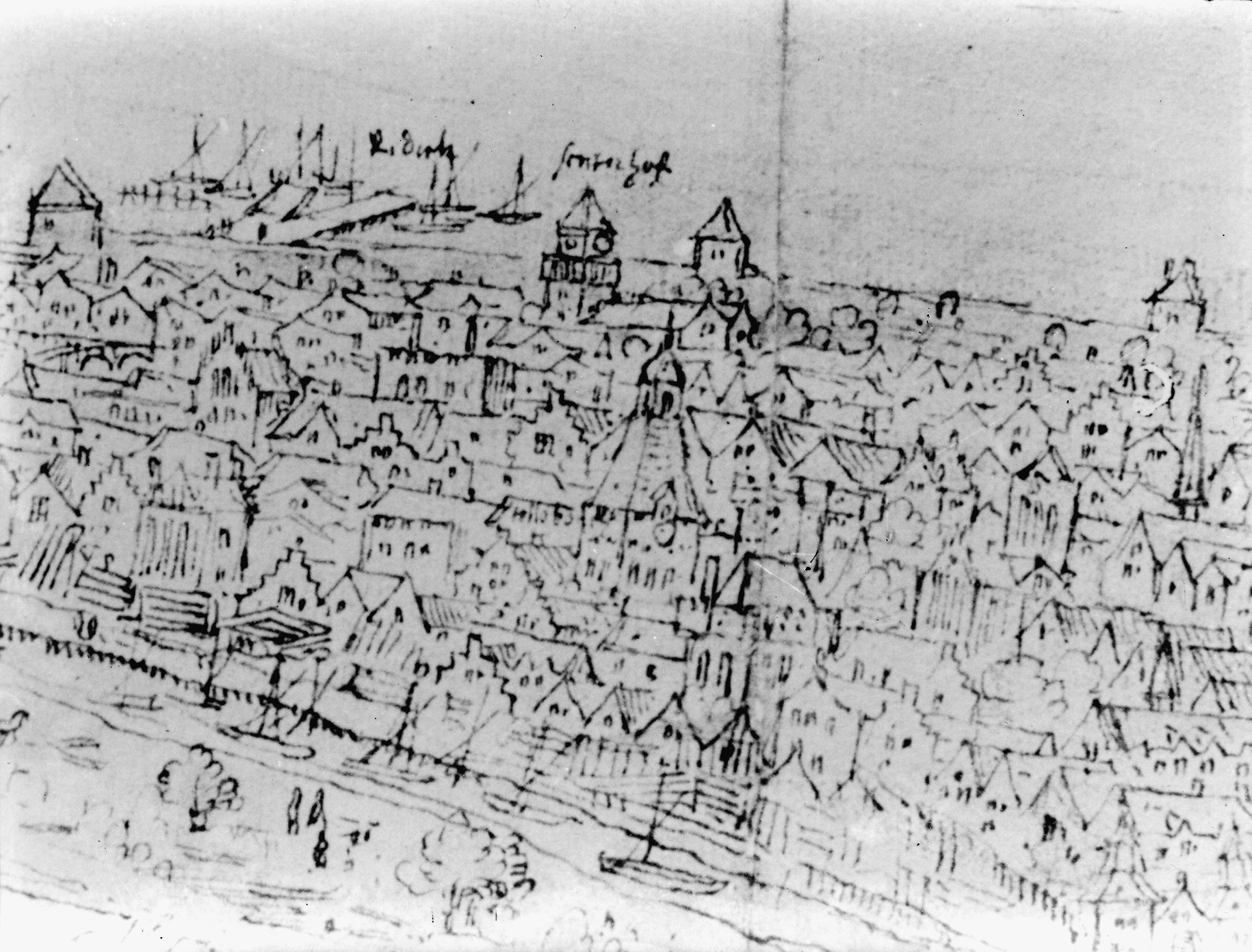 Linker deel van een tekening van Dordrecht door Anthonie van Wijngaarden.