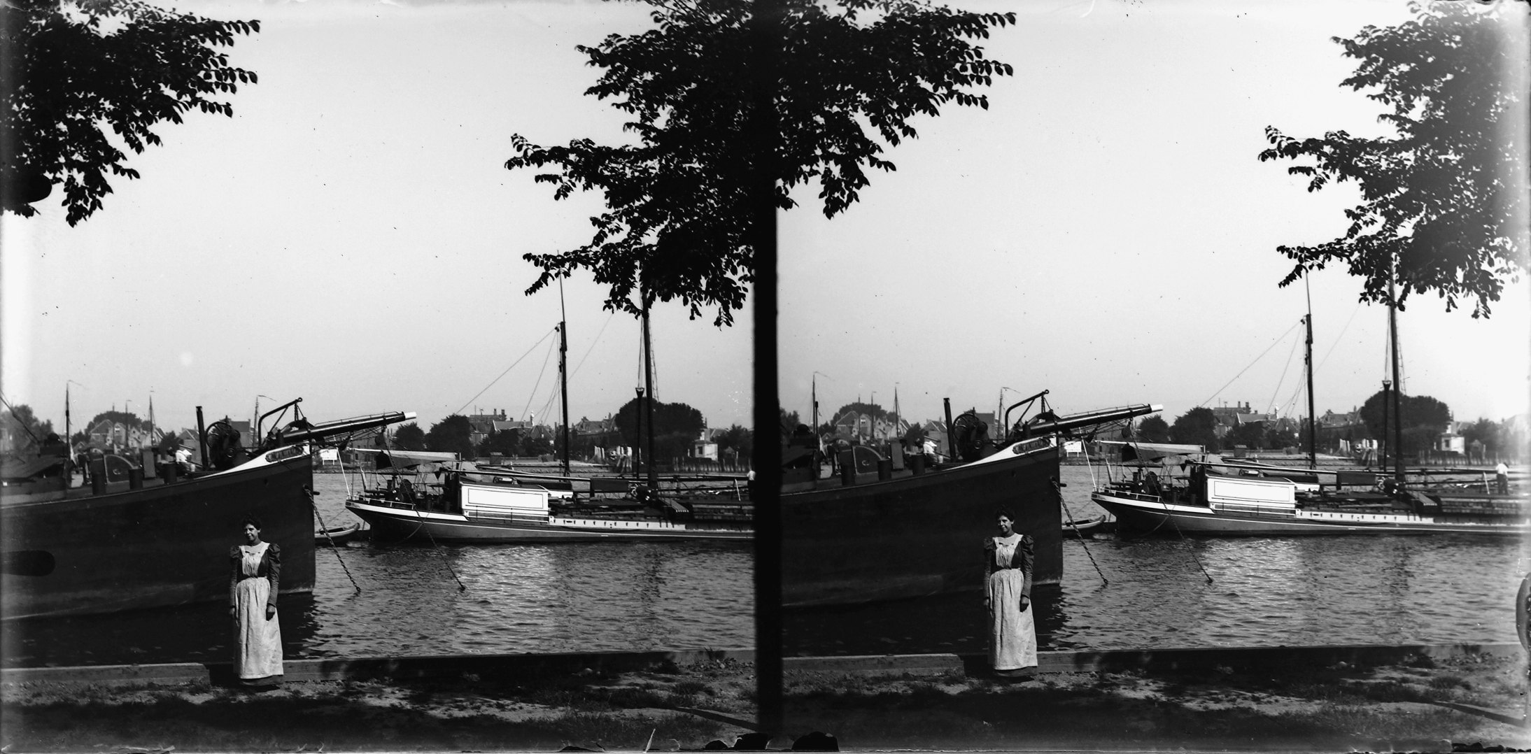 Stereofoto vanaf de Hooikade over de Oude Maas naar het Veerplein in Zwijndrecht.