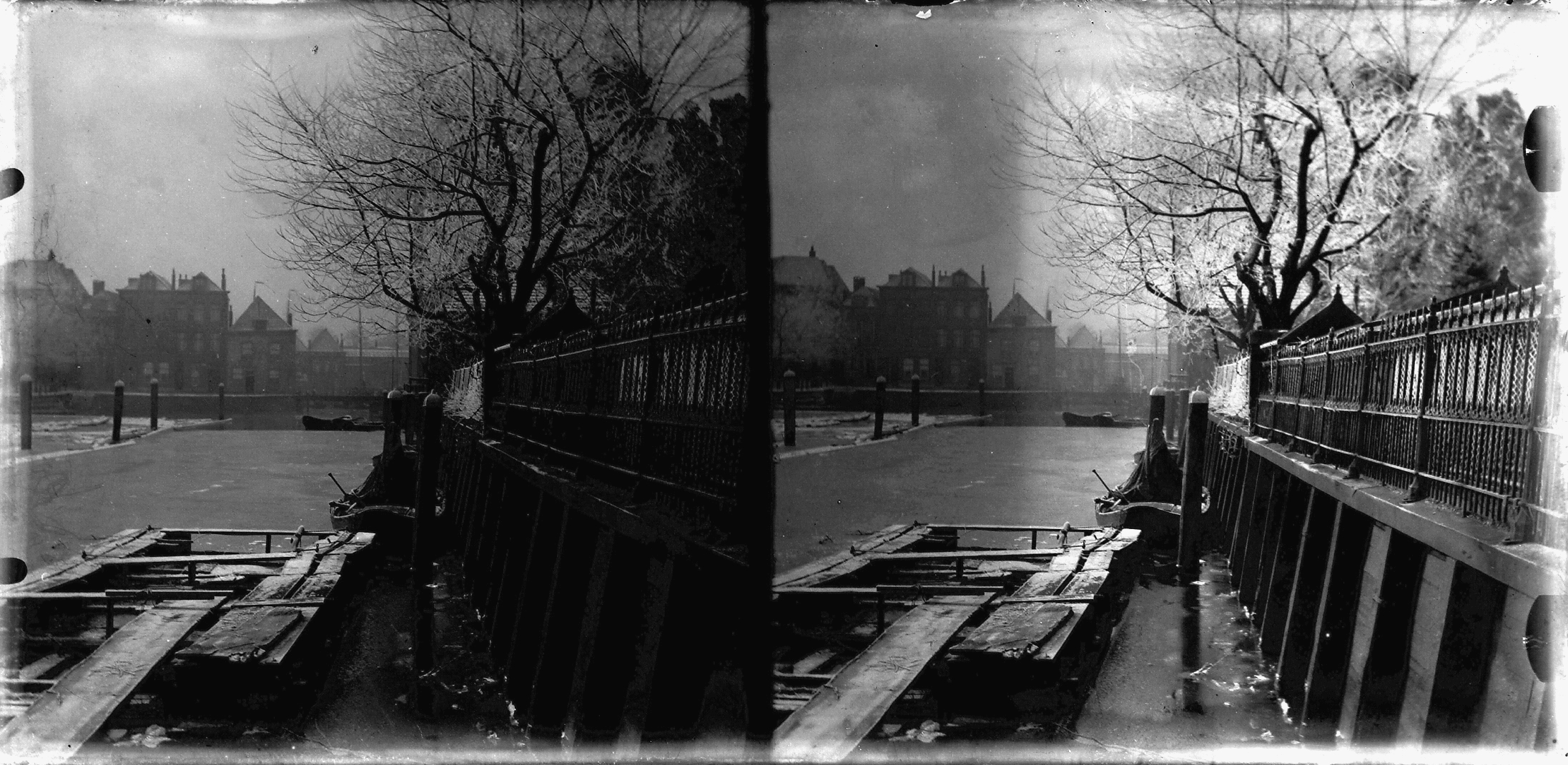 Stereofoto van het Maartensgat vanaf de Korte Engelenburgerkade richting Korte …