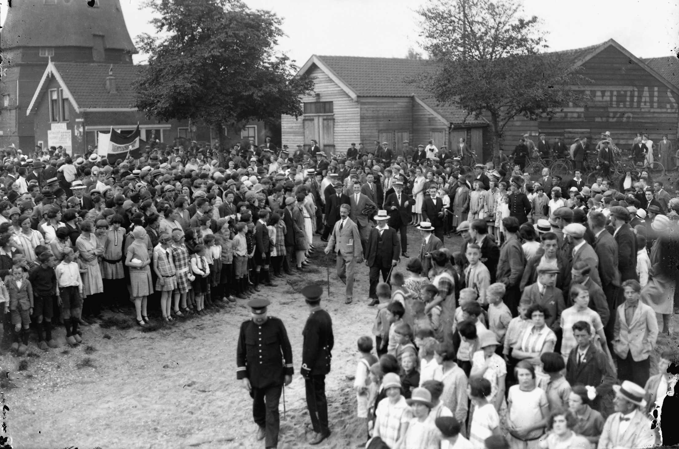 - Publiek bijeen bij het vertrek van deelnemers aan het vakantiekinderfeest op een terrein tussen Weeskinderendijk en Papegat bij de romp van molen De Pelikaan.
